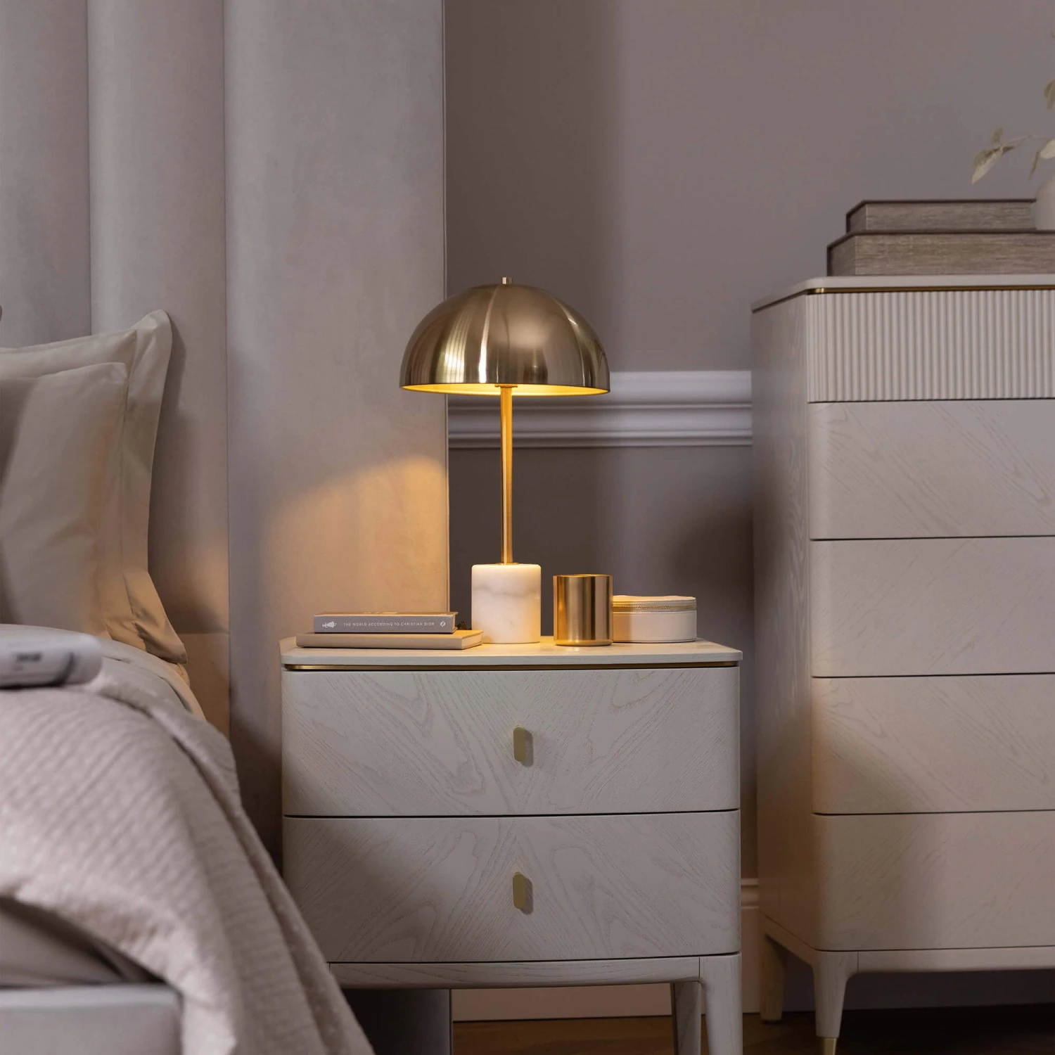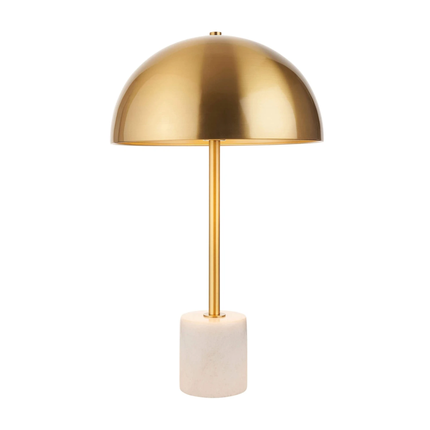 Add a minimalistic and elegant touch to your home with this Aged Brass & Marble Table Lamp. Illuminable by a required E14 LED bulb, this chic table lamp features a unique dome shaped shade in a soft aged brass colour, with a complimenting white marble base, allowing a harmonious contrast and pleasant atmosphere in any room. Operated by an inline switch allowing for easy use. The perfect blend of classic design and modern aesthetics, this sophisticated table lamp will add a noble and timeless design to any décor, whether it is situated on a table or sideboard, it will become a stylish yet decorative element in any contemporary space.