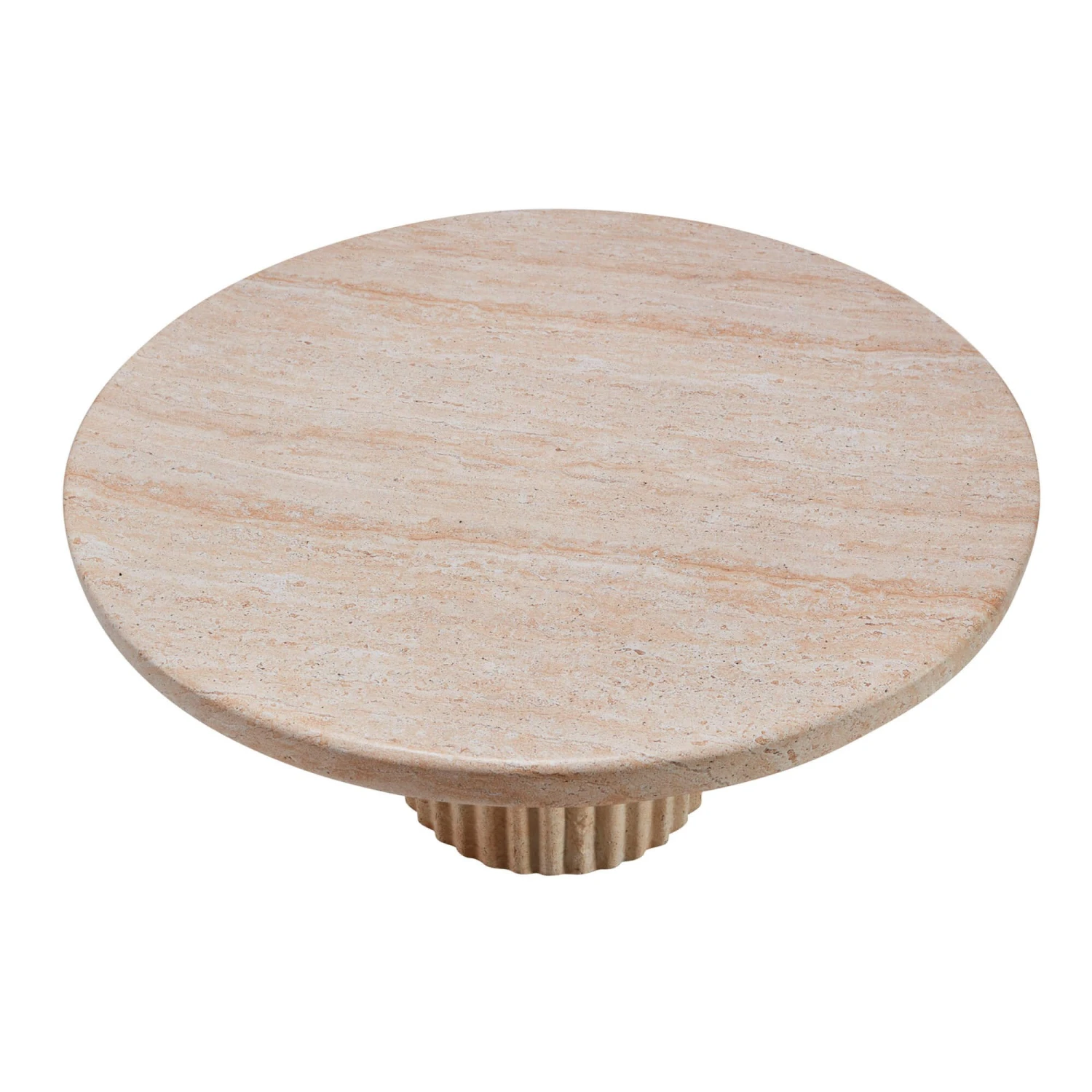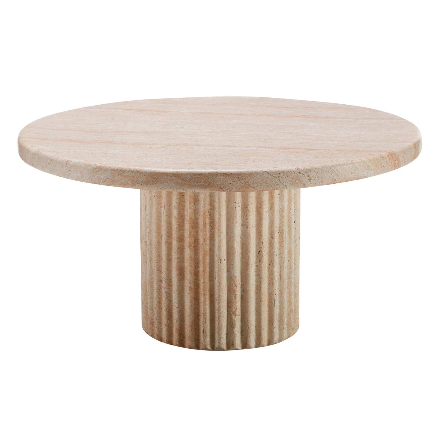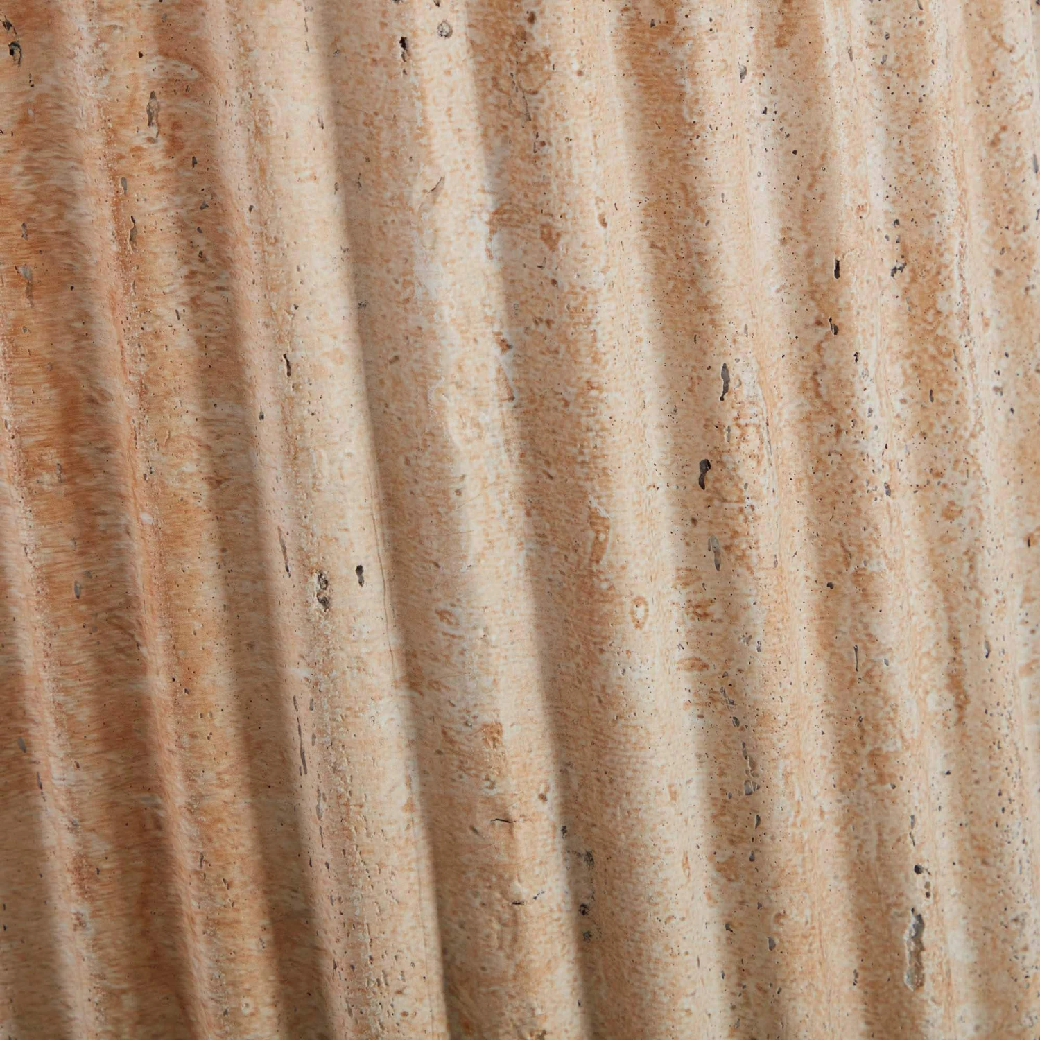 A wonderful concrete coffee table with a bold column base that has a wrap-around reeded design. The reeded effect that wraps around the middle has a stunning travertine effect finish that adds visual intrigue to the piece. With a soft, complimenting table top. The faux travertine coating provides the table with a distinct style and also helps create a protective coating.