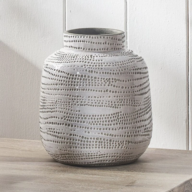 The Alina White Dotted Terracotta Vase is a beautifully crafted piece that captures a distinctly Scandi-inspired aesthetic, perfect for modern and minimalist interiors. This cylindrical terracotta vase features a gently rounded body and a flat neck at the top. The entire surface is adorned with a unique textured dotted finish, where the dot design creates a captivating aesthetic.