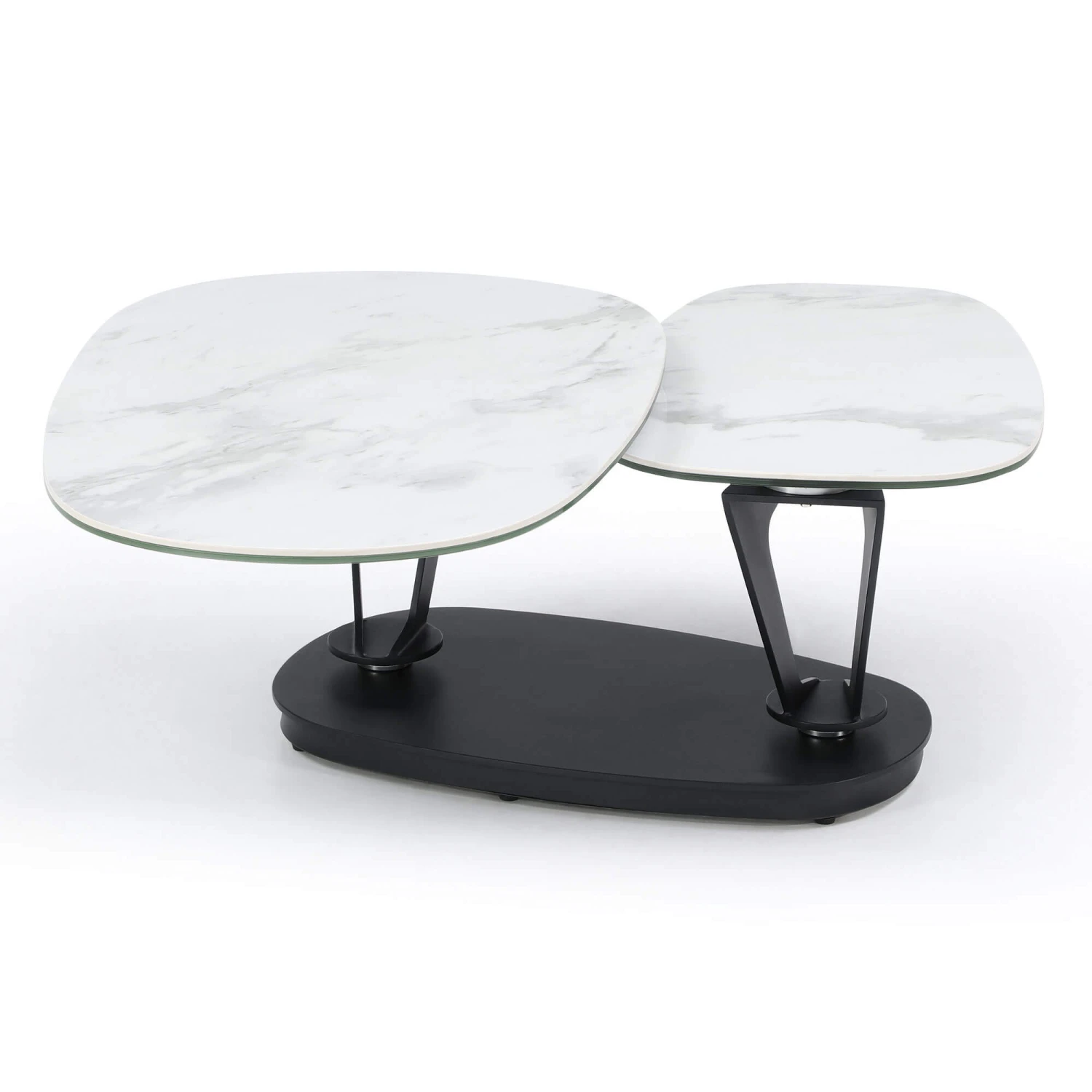 The beautiful Andria coffee table offering versatility that allows you to expand for more surface space or close to make smaller when not in use. Designed with polished marble effect ceramic bonded to clear glass. Aluminium bosses are bonded to the underside of the glass to allow the supports to be bonded to the powder coated steel frame. Due to the weight of the base take care when lifting, do not lift from the base.