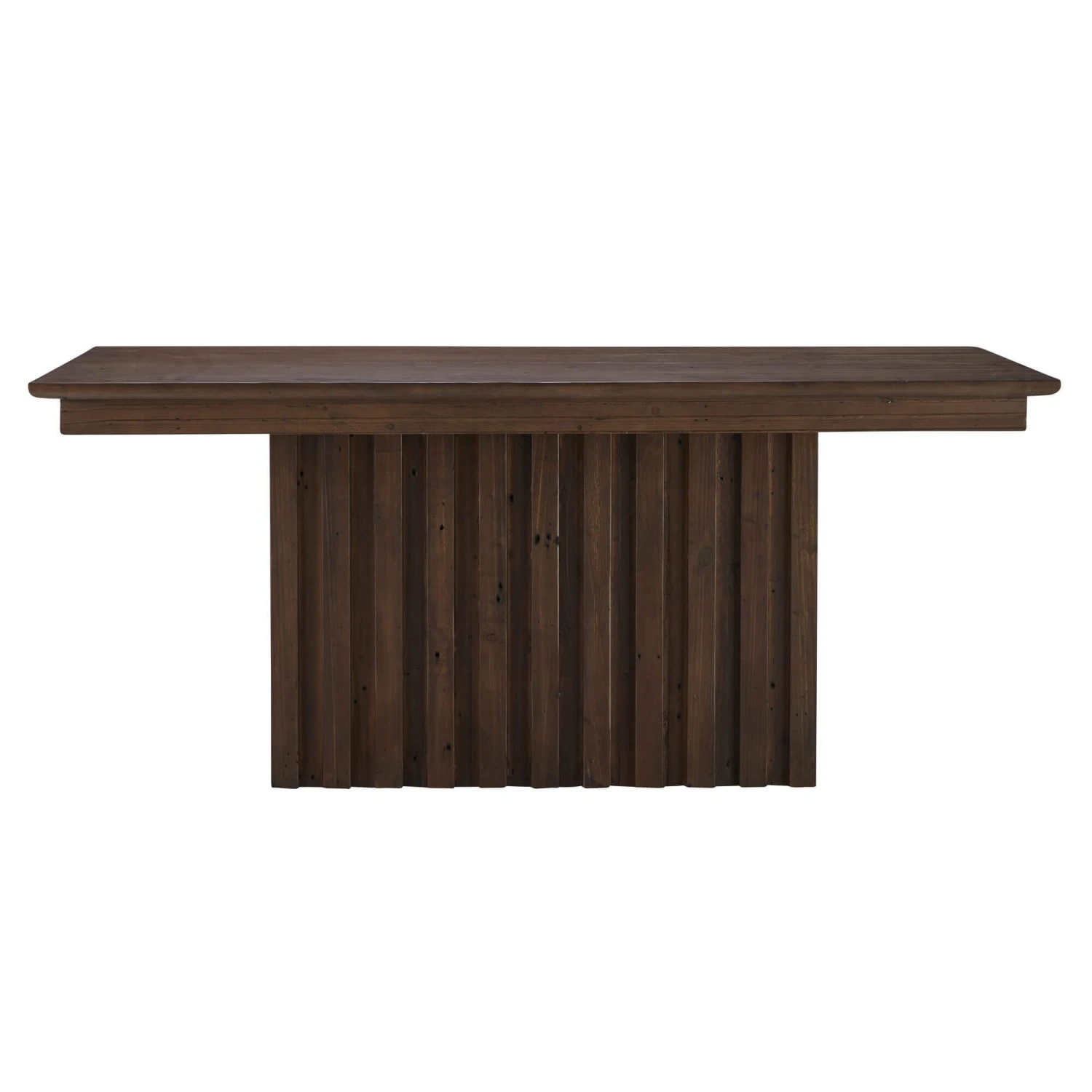 A large 210cm reclaimed wood dining table in a rich brown that combines rustic charm with modern design, making it an ideal centrepiece for any dining room. Crafted from natural wood, the rectangular fixed table measures 210cm and features a beautifully panelled design that showcases the unique wood grain, highlighting the character and warmth inherent in renewed wood tables. The dark wood tones lend a sophisticated depth, whilst the solid construction ensures durability and timeless appeal. The table’s distinctive reeded base adds a subtle yet striking texture, elevating the overall aesthetic.