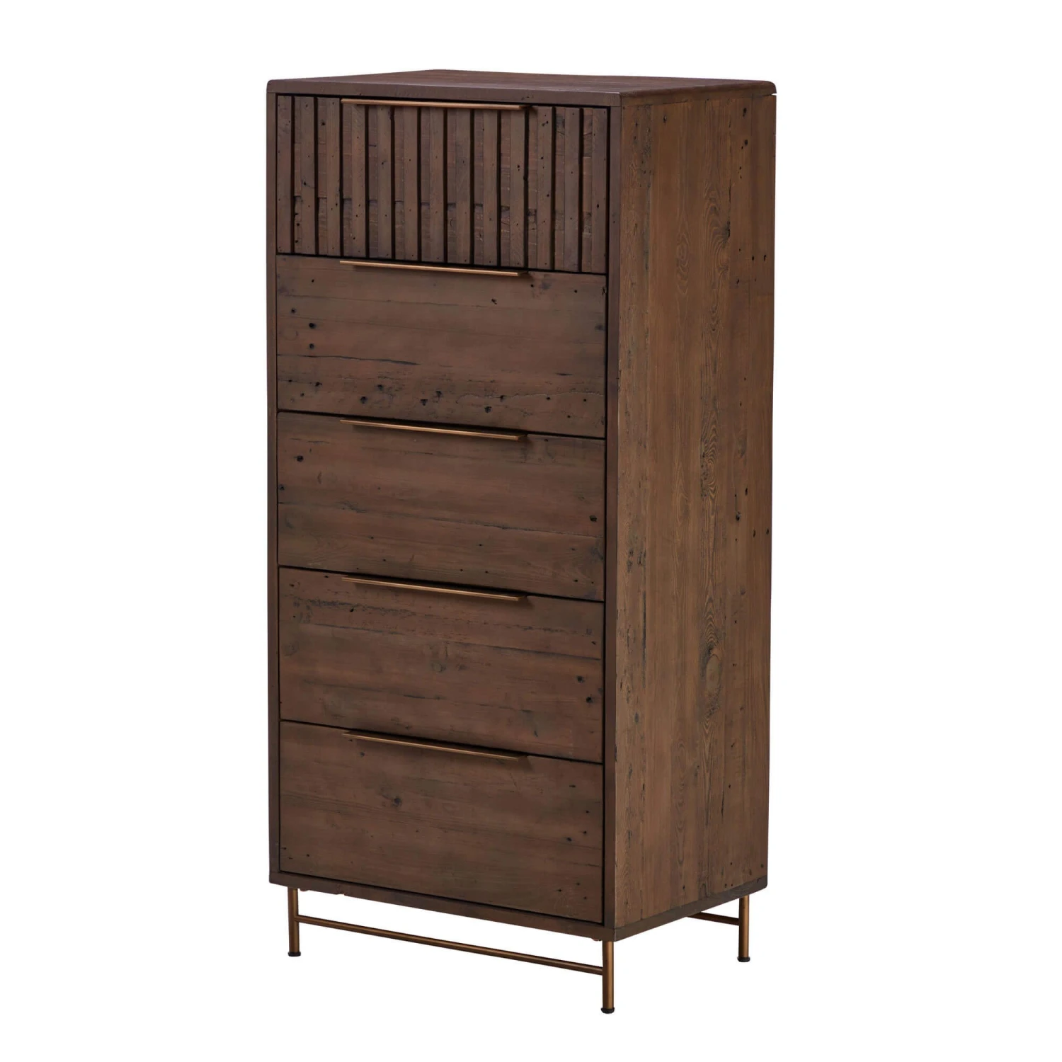 A 5 Drawer Tall Chest that brings the feeling of rustic elegance to your space. Crafted from solid pine, the unit showcases the natural beauty of the wood grain and features a unique panelled design to add visual interest. With brass coloured handles and legs that add a touch of industrial style, it creates a warm and inviting contrast.