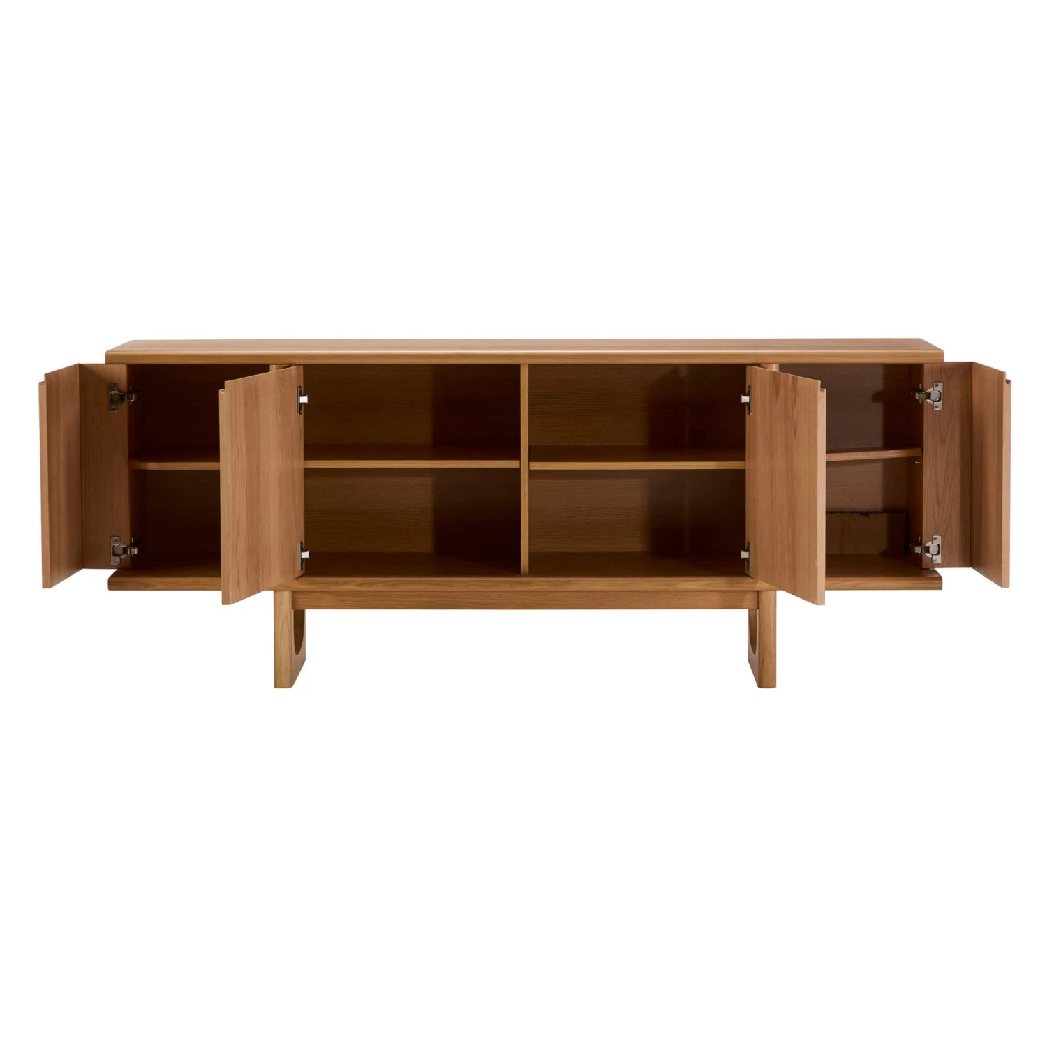 Introducing the Arden Natural Oak Sideboard, a sophisticated solid oak storage solution ideal for both living and dining rooms. Meticulously crafted with a classic rectangular top, this modern sideboard features distinct legs that each mimic an upside-down arch, creating an organic U-shape that gracefully connects through the base with a singular wooden beam. The legs run through the unit, forming fluid dividers that transform this contemporary oak sideboard into an artistic statement. Carefully aligned wood grain and a full bullnose edge on both top and base enhances the sideboard’s natural beauty, showcasing the rich textures and warm tones of the oak.