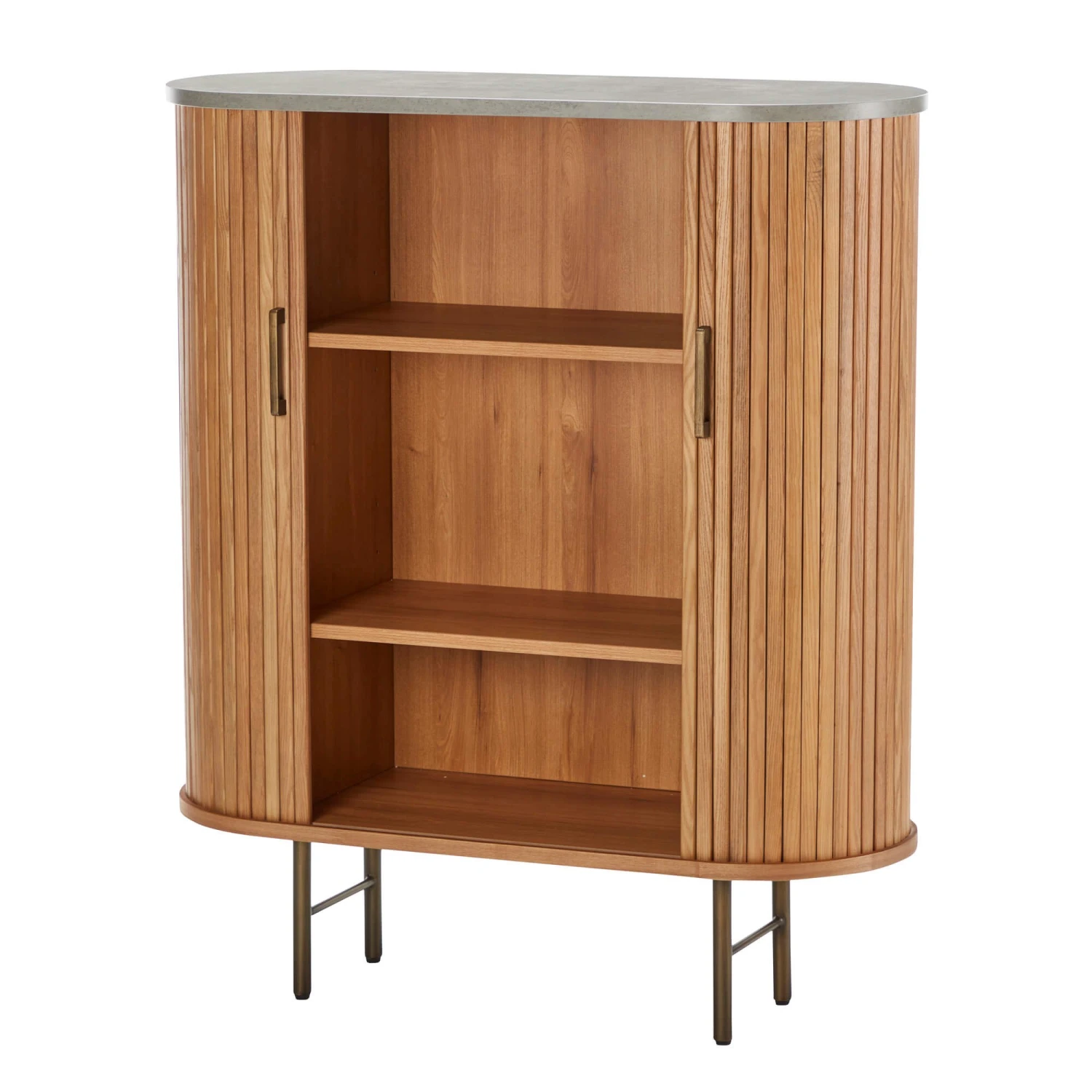 A natural tone cabinet featuring a vertical panel design with curved edges for a sleek Scandinavian style. Crafted with shelving for plenty of storage to keep your home tidy, This display cabinet also creates a beautiful space to accessorise while keeping your documents, spare glassware or living room accessories tidy.