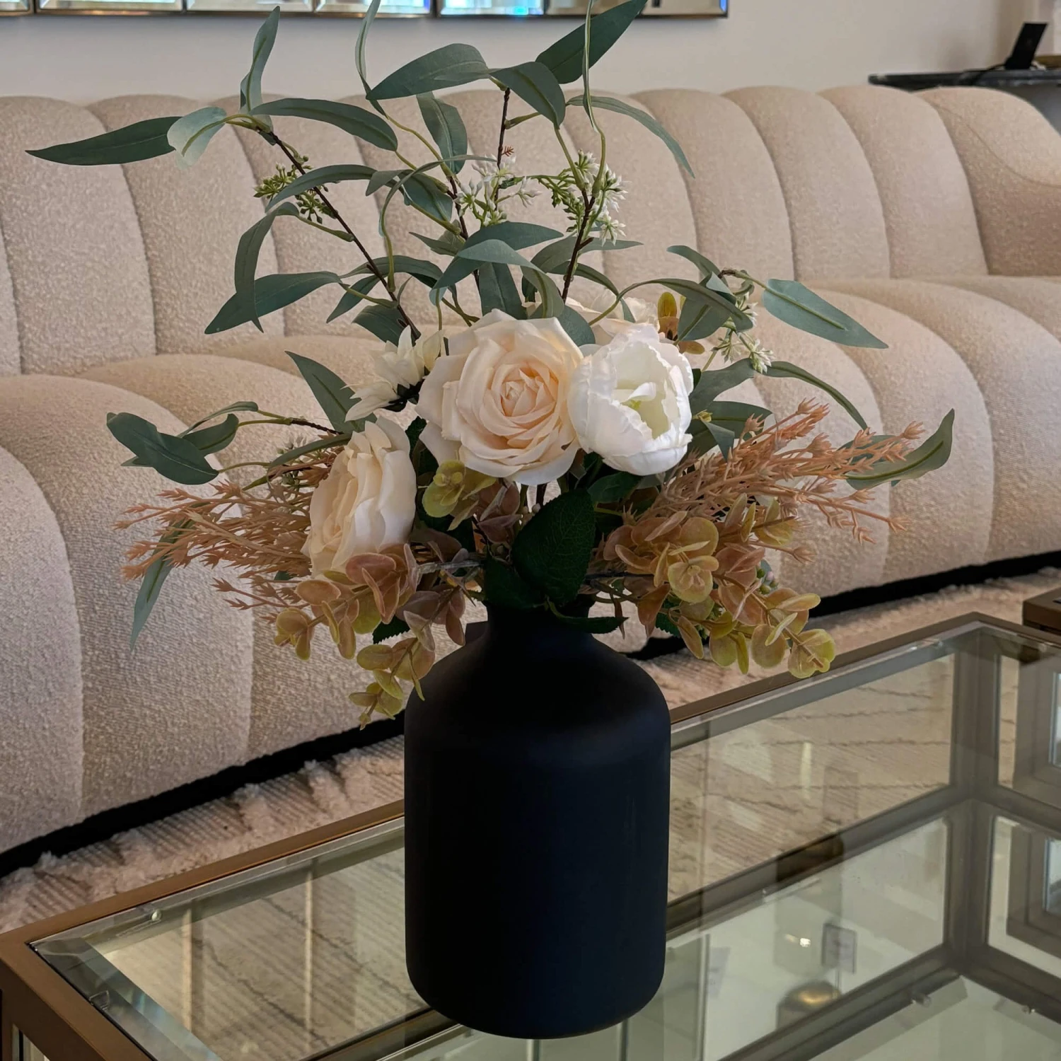 The bouquet is paired with an elegant bottle vase that features a smooth, black finish in a uniform colour that adds a subtle, sophisticated touch to any space. Its simple design is enhanced by a small lip around the top of the neck, providing a delicate detail that complements its minimalist silhouette.
