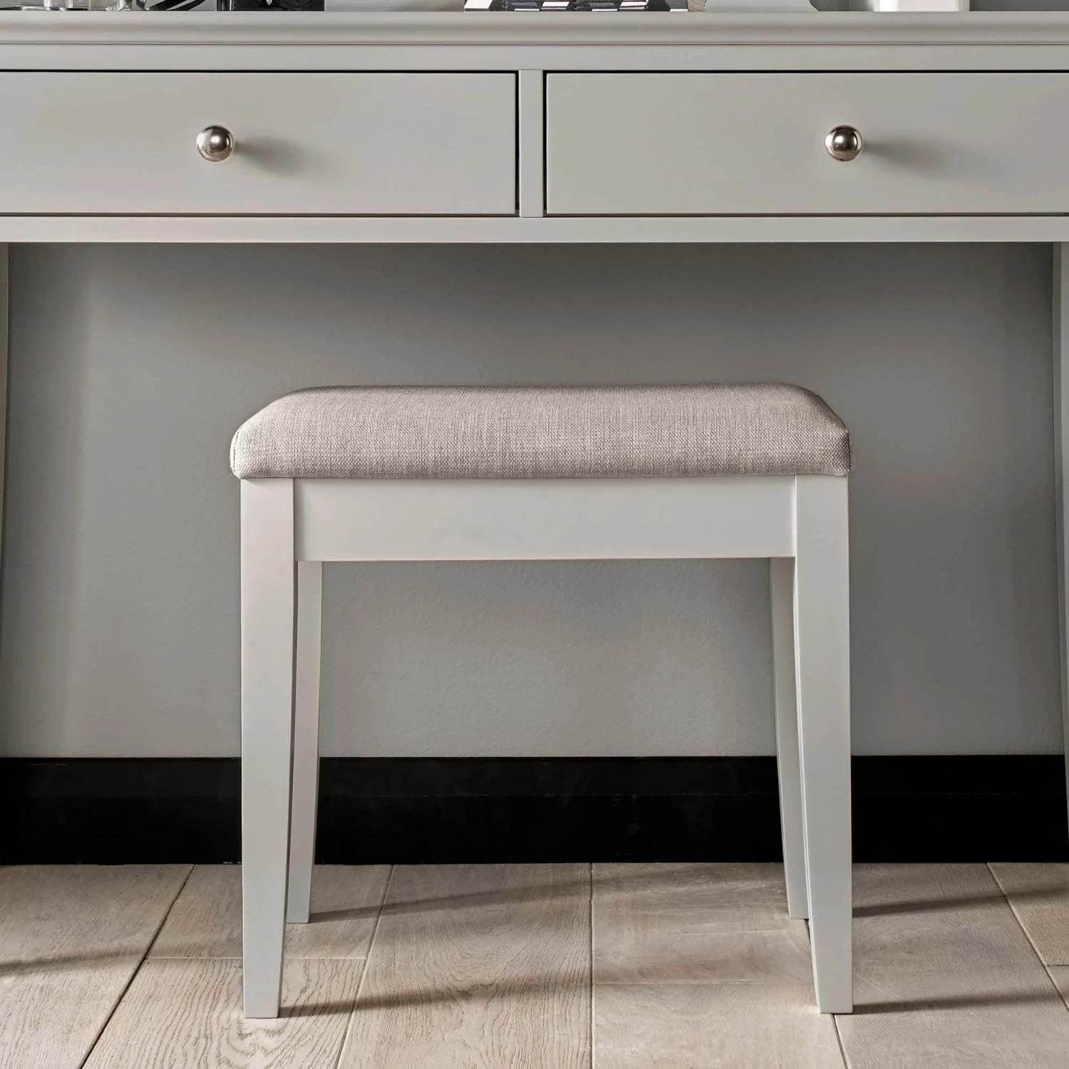 The Ascot Soft Grey Dressing Table Stool features a cushioned seat for extra comfort, upholstered in a versatile pebble grey fabric. Team with the Ascot Soft Grey Dressing Table and Vanity Mirror (each sold separately) for a beautiful and functional set.