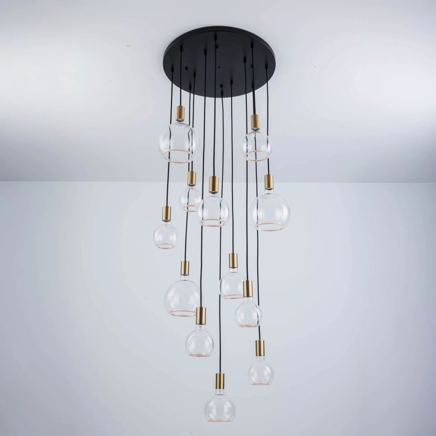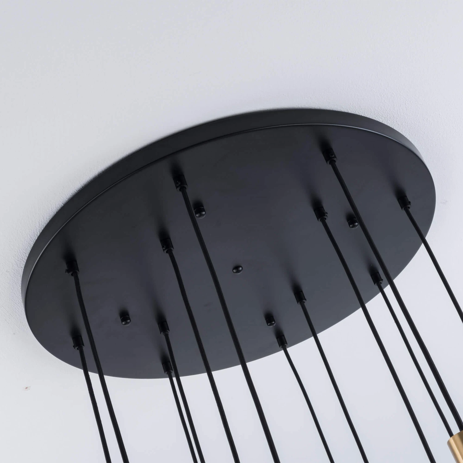 Create a stylish yet industrial style lighting for your home with this Aura Gold 12 Light Ceiling Plate. Made from metal, this striking pendant light ceiling plate features a black round base with twelve sleek gold light bulb fittings. Offering style and functionality, it can be arranged in a random or spiral design. Available in various sizes, this sophisticated pendant light ceiling plate is perfect for making a statement and elevating any room with its unique and contemporary design, making it ideal installed above a staircase or dining table.