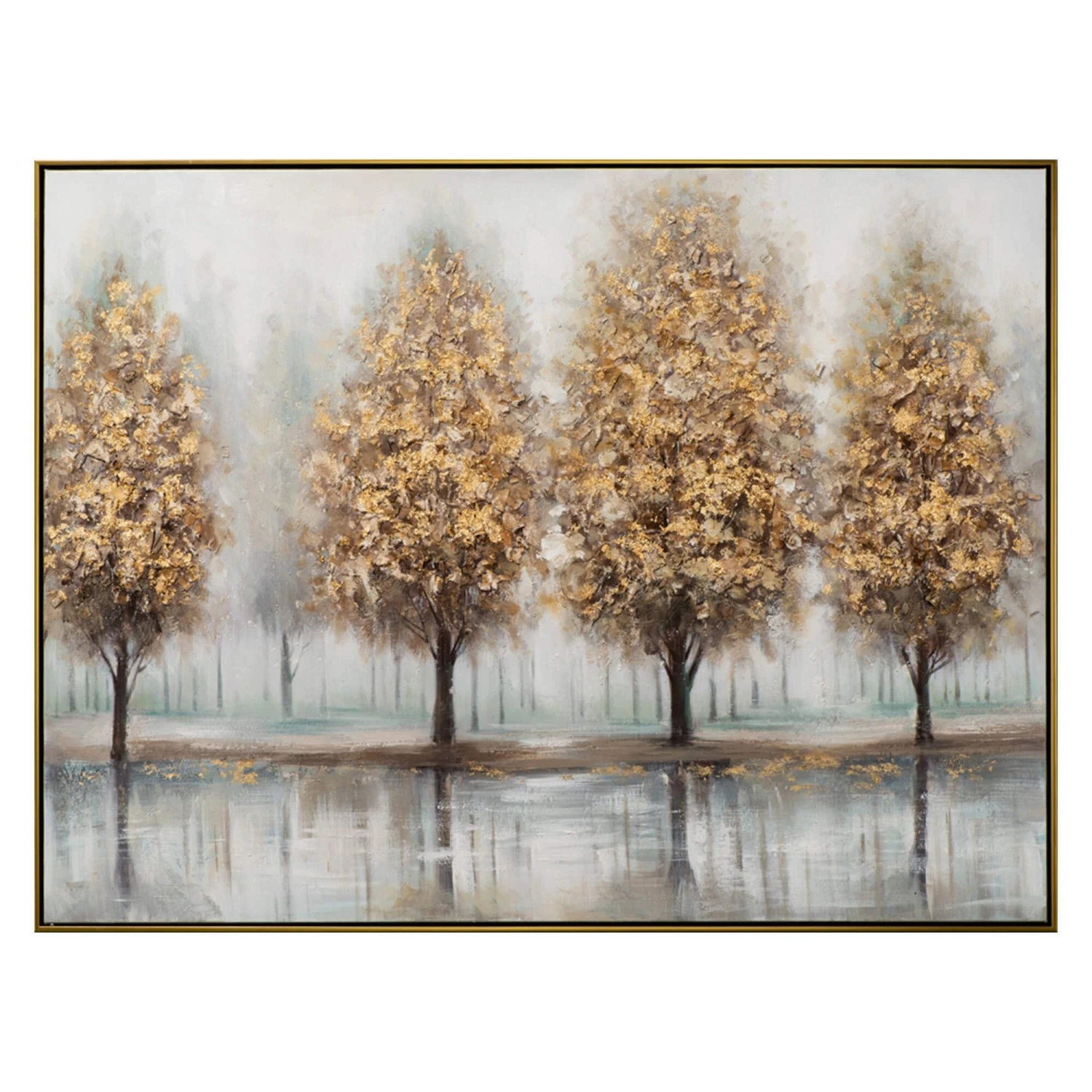 This stunning hand-painted canvas print brings a touch of autumnal elegance to your home. The four golden trees stand tall against a backdrop of soft mist, their reflections shimmering in the still waters below. The intricate details of the leaves and branches paired with the calming colour palette create a peaceful and inviting atmosphere.