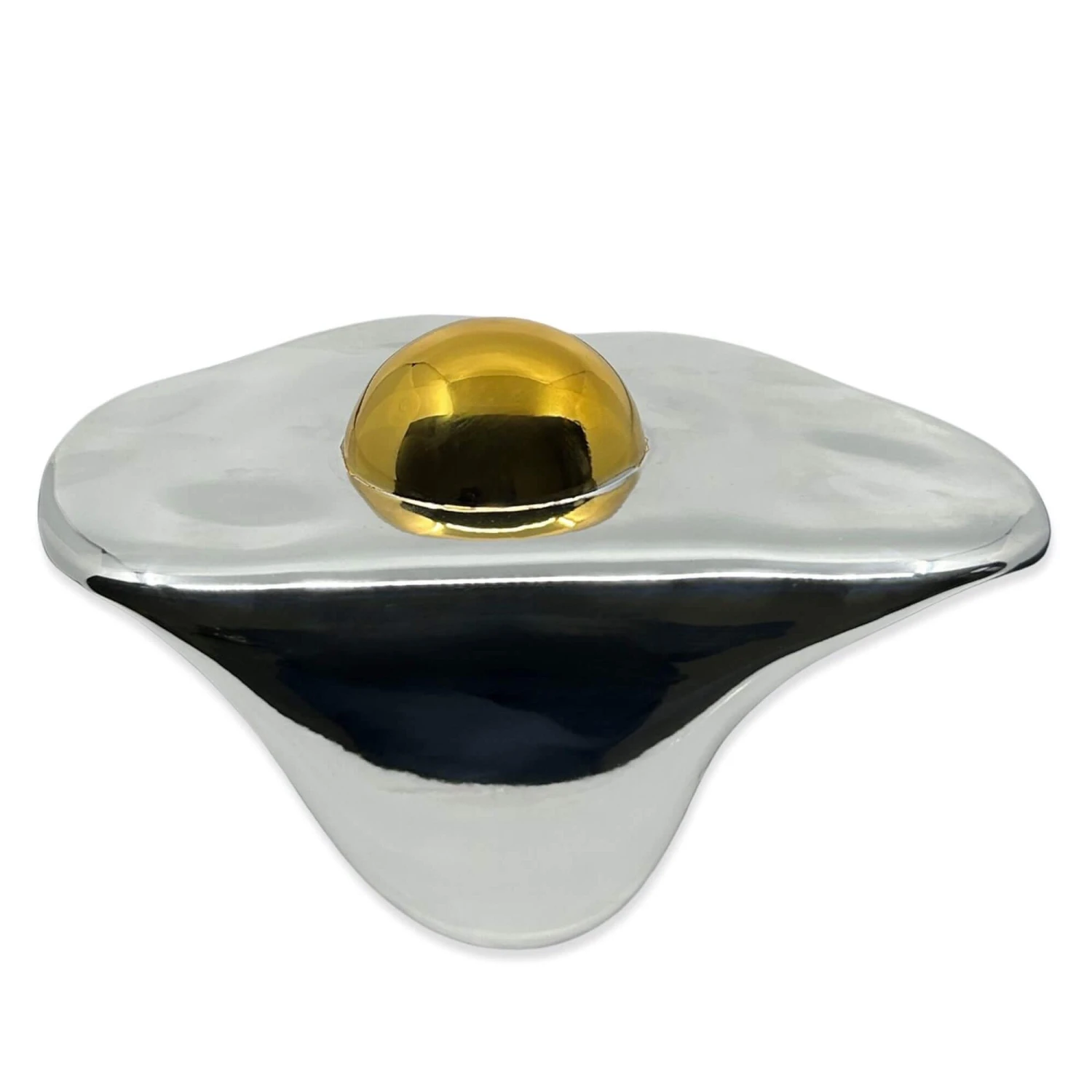 A novelty runny egg decoration to add character to your space. This resin egg is finished in a silver plate, mimicking egg whites, with a matching gold plated finish that mimics the yoke. The eggs bold look adds flair and adds a touch of personality to your space.