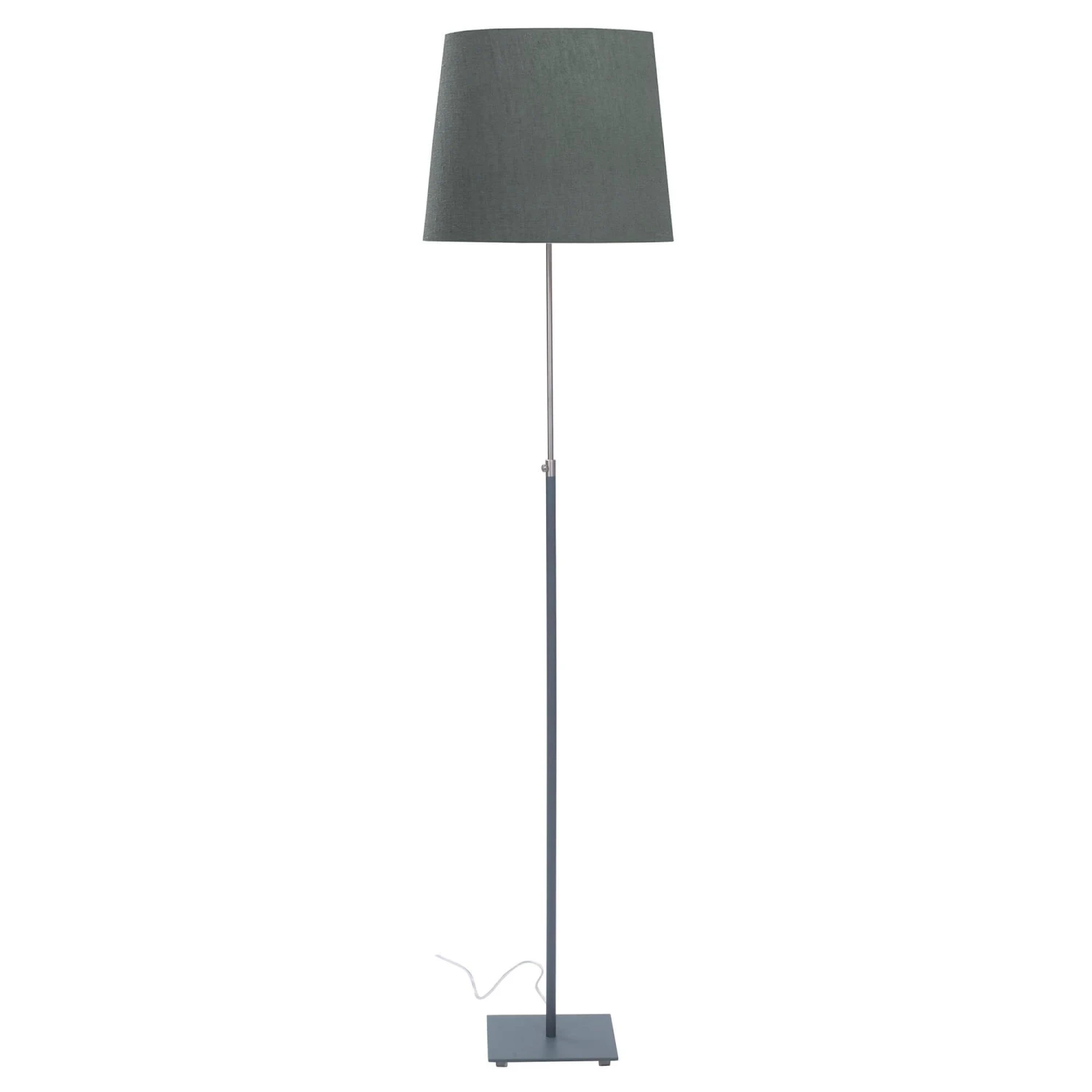 A height adjustable, slender floor lamp in a soft grey. The lamp has a flat, square base ensuring the light is versatile whilst also remaining steady. At the top is simple cylindrical lamp shade providing the lamp with a clean, contemporary look. In the middle is an adjustable knob allowing you to raise and lower the height of your lamp, ensuring that it sits comfortably in any space.