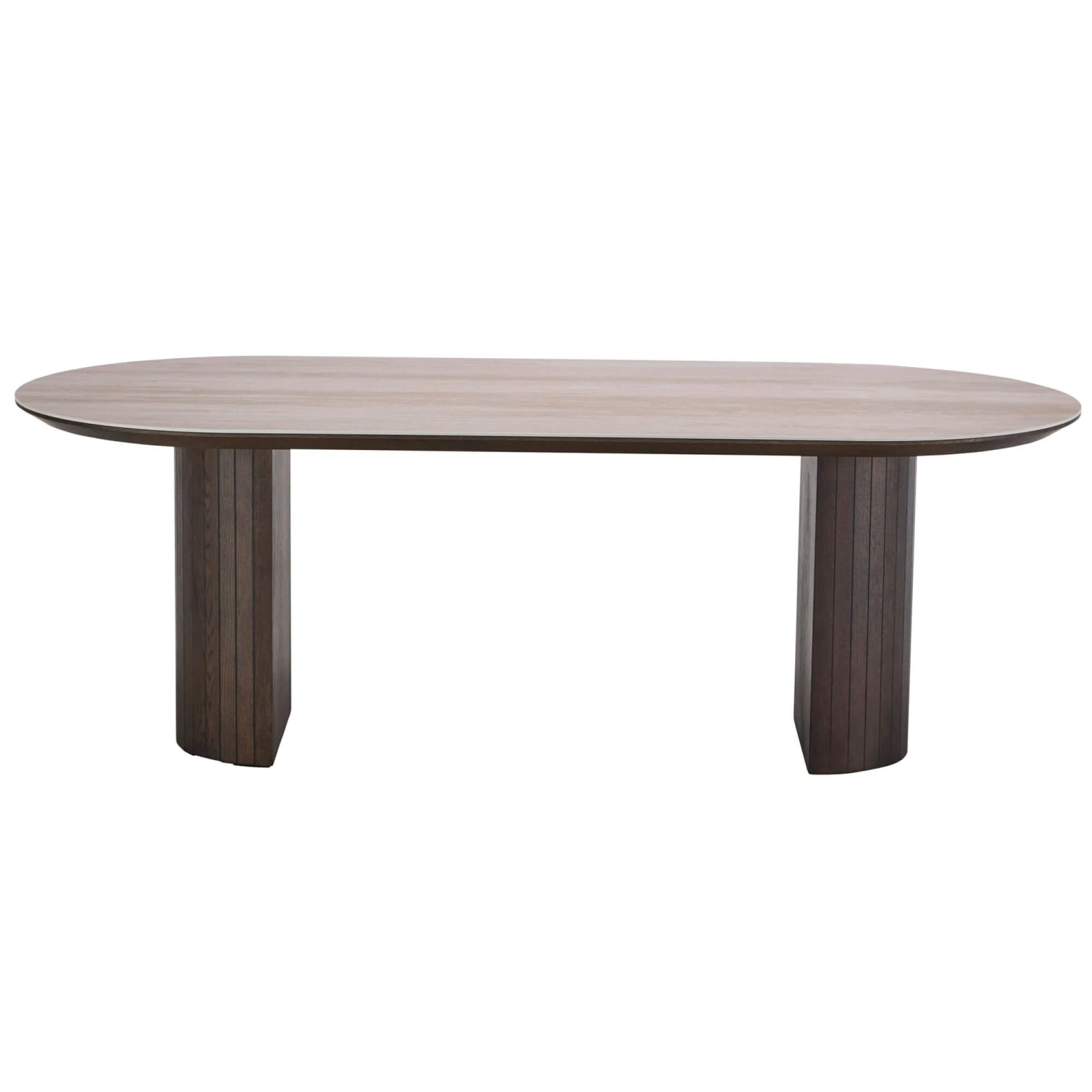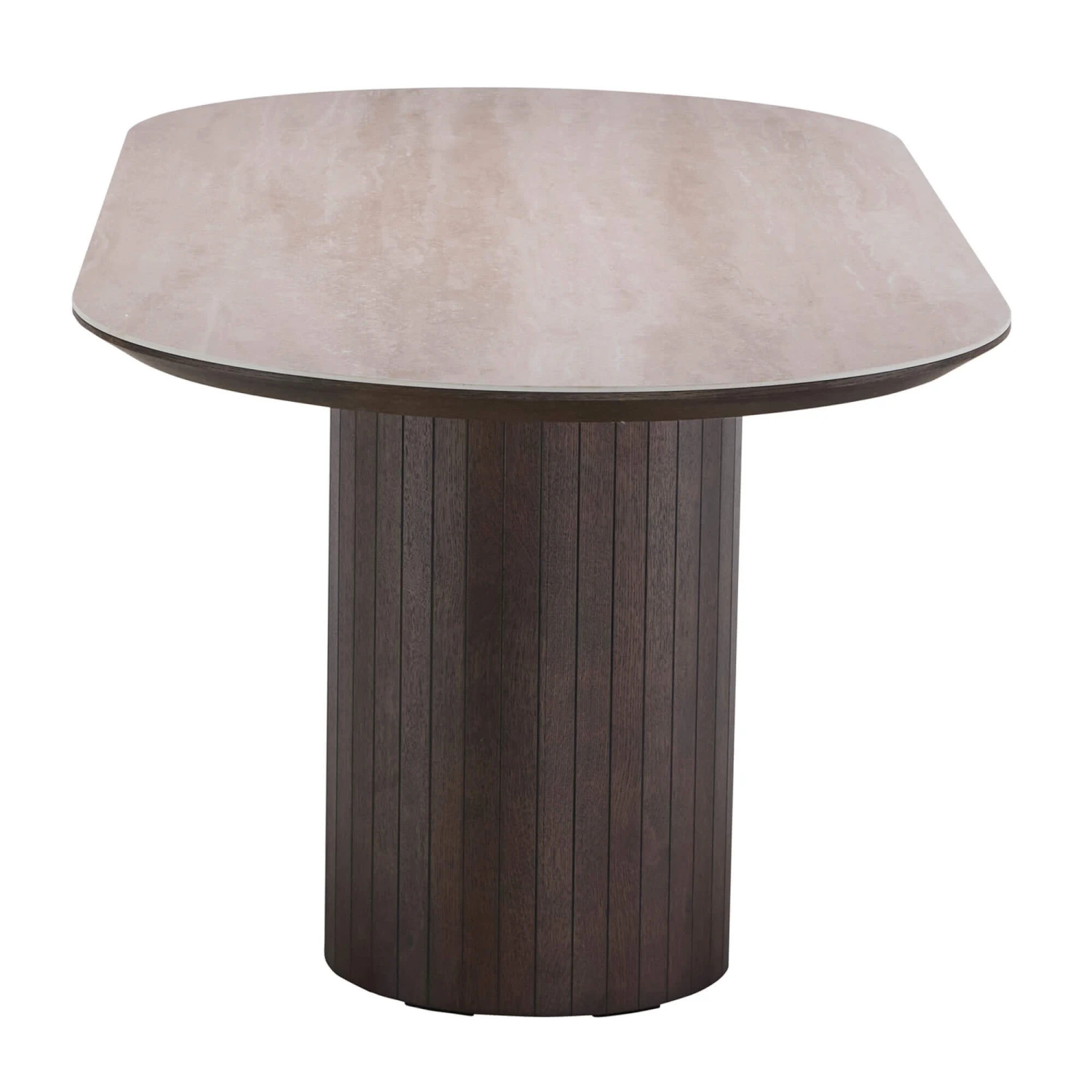 An expansive 220cm dining table that offers ample seating space for family gatherings and events. The sophisticated table features a beautiful naturally coloured travertine top. Supporting the elegant table top are two hemisphere column with vertical wooden panels that run down each podium. The flat, straight side of the bases add a sleek architectural element, while the overhanging oval top provides a dynamic visual contrast. With a boat edge profile finish, it further enhances the tables unique and stylish appearance.