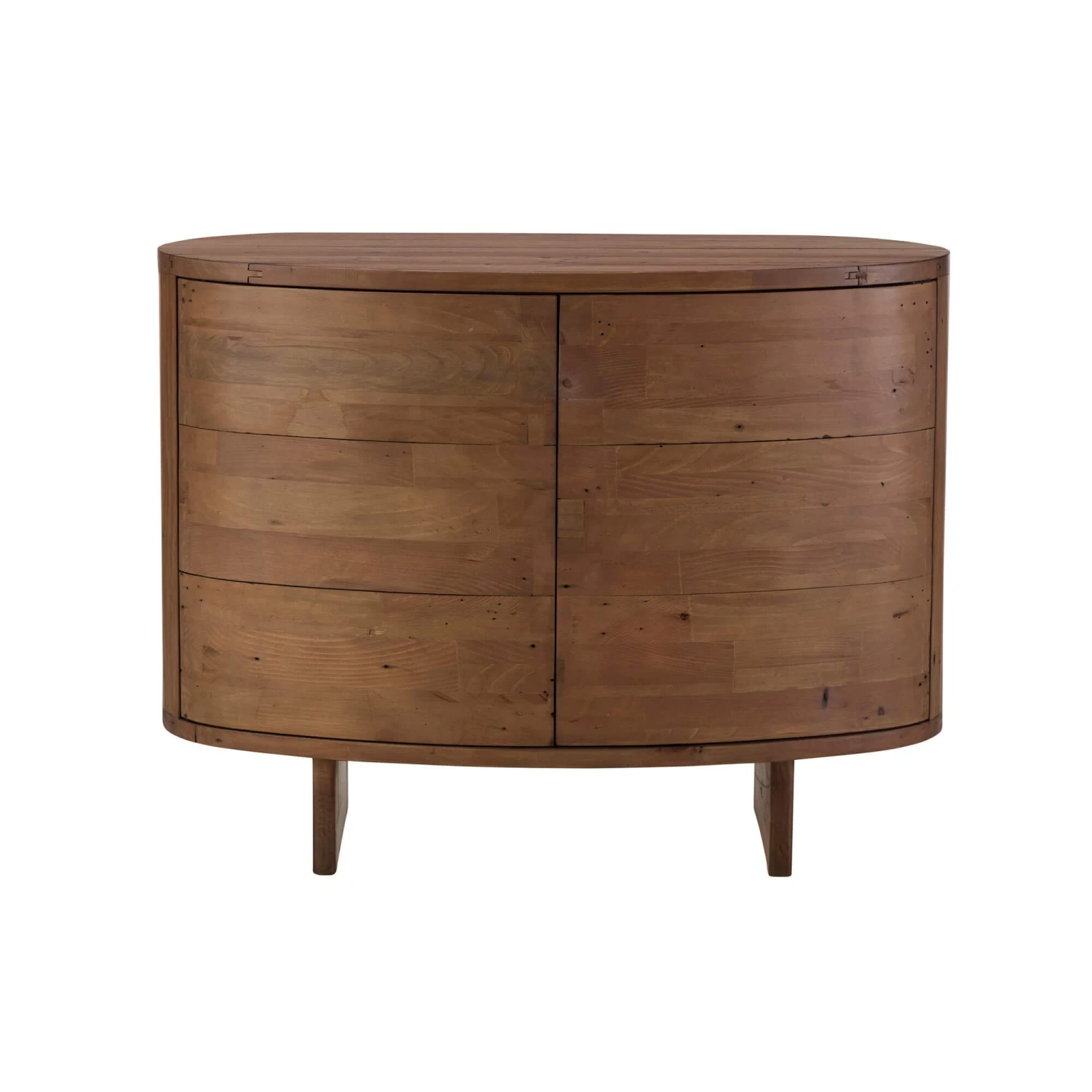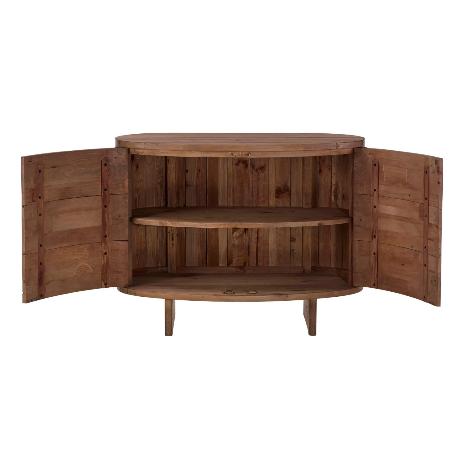 A spacious 2 door sideboard featuring vertical reclaimed wood panelling that wraps around the unit, at the front are two large push to open doors, each that feature three large wooden panels run the opposite direction. The front of the unit subtly arches outwards with doors that run flush creating a seamless look. Being made from reclaimed wood, each piece features its own unique style with varying grain and spike holes showcasing its distinct style. Inside the unit is a large oval shelf that mimics the top of the sideboard.