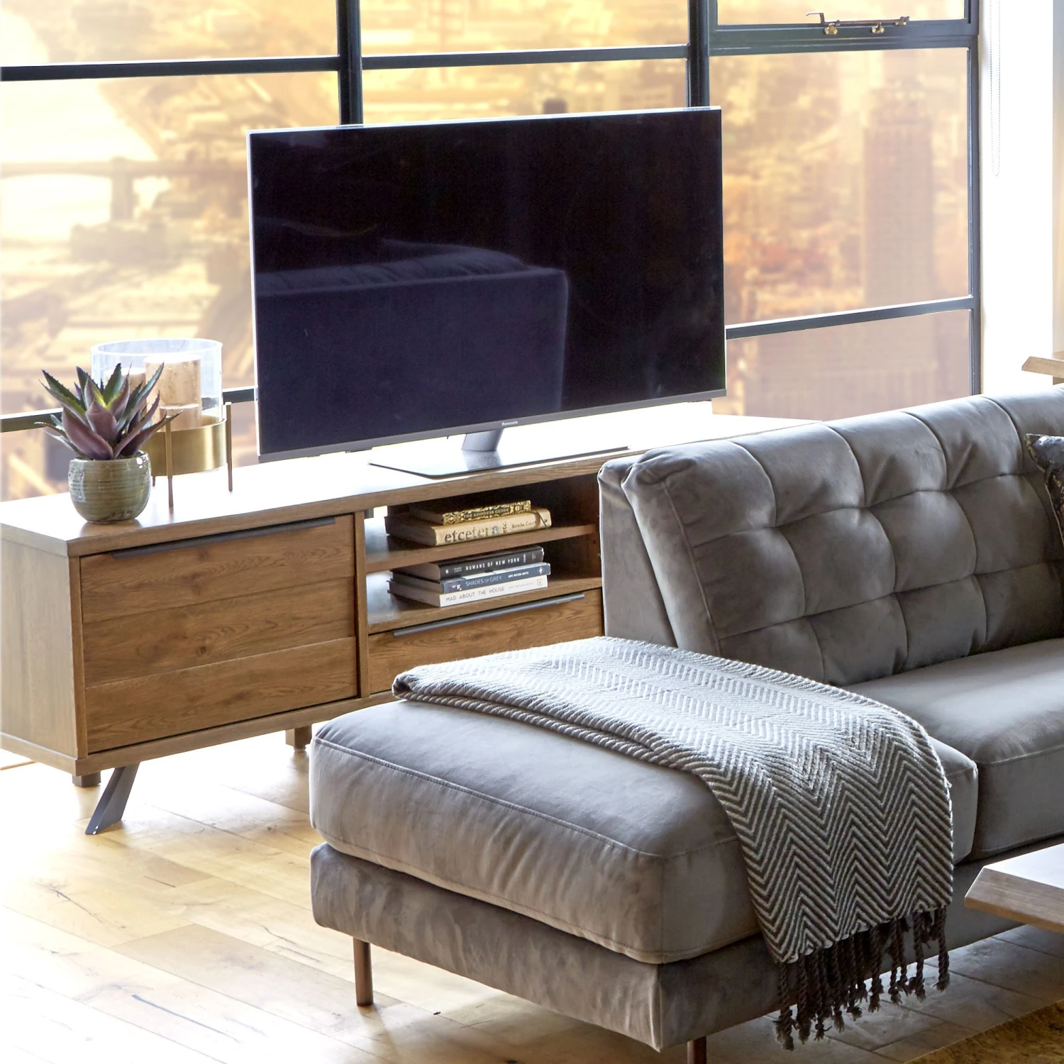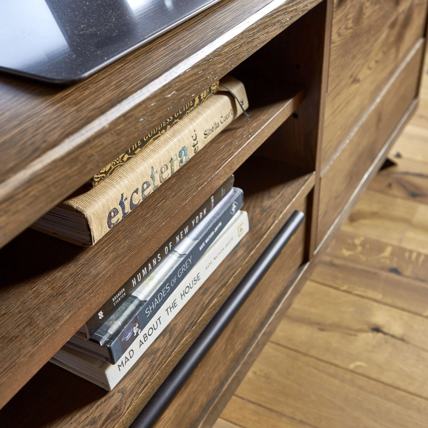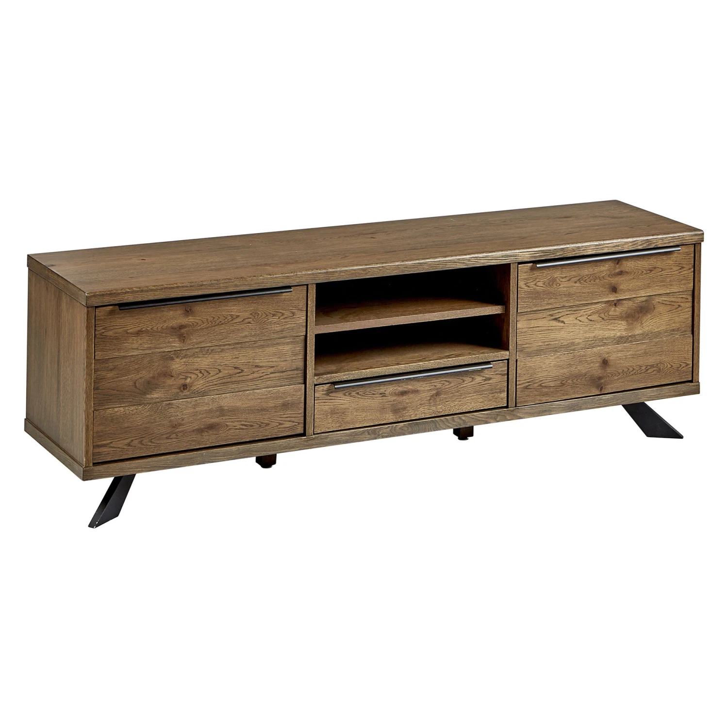 The cupboard doors and drawer fronts have a panelled effect for added interest, with sleek and stylish long metal handles to enhance the natural tones of the TV Lowboard whilst adding to the industrial feel.