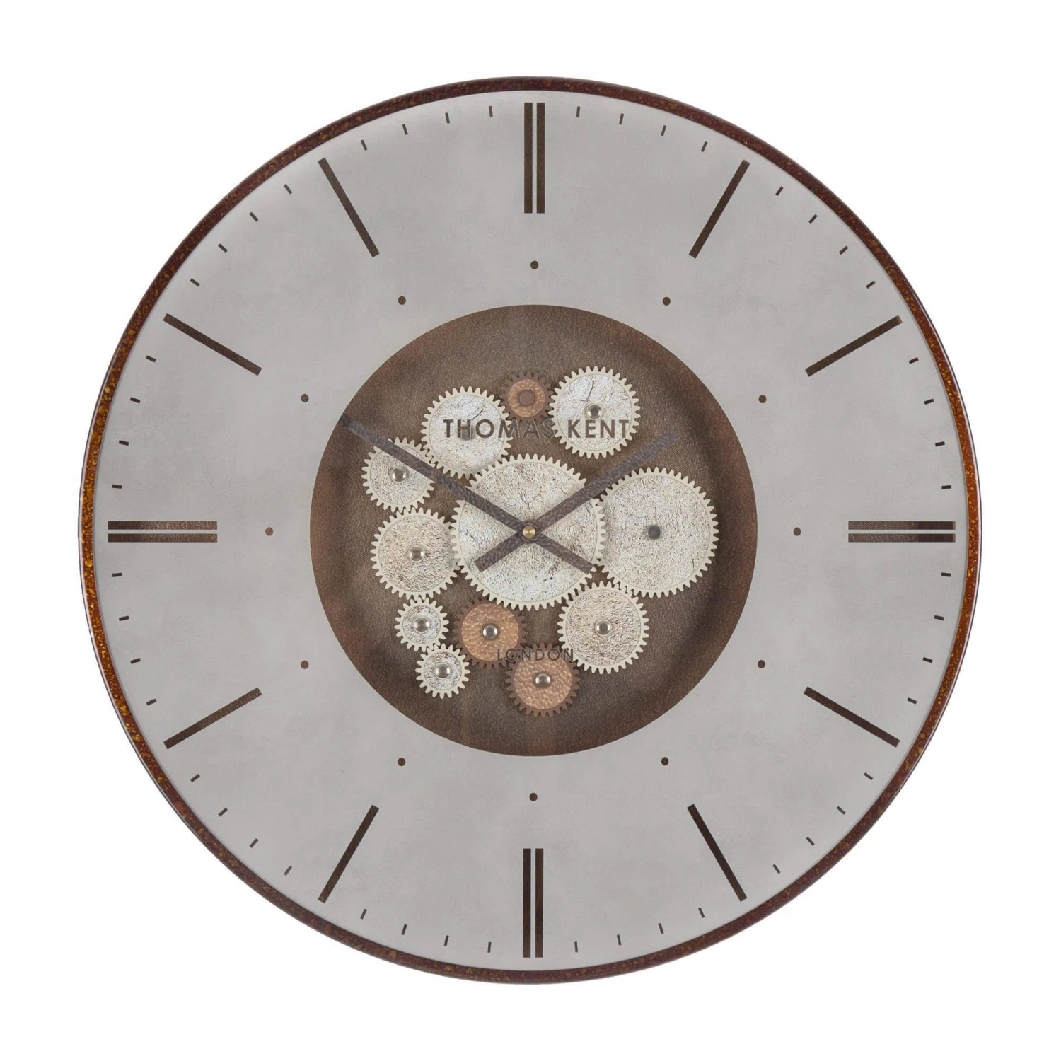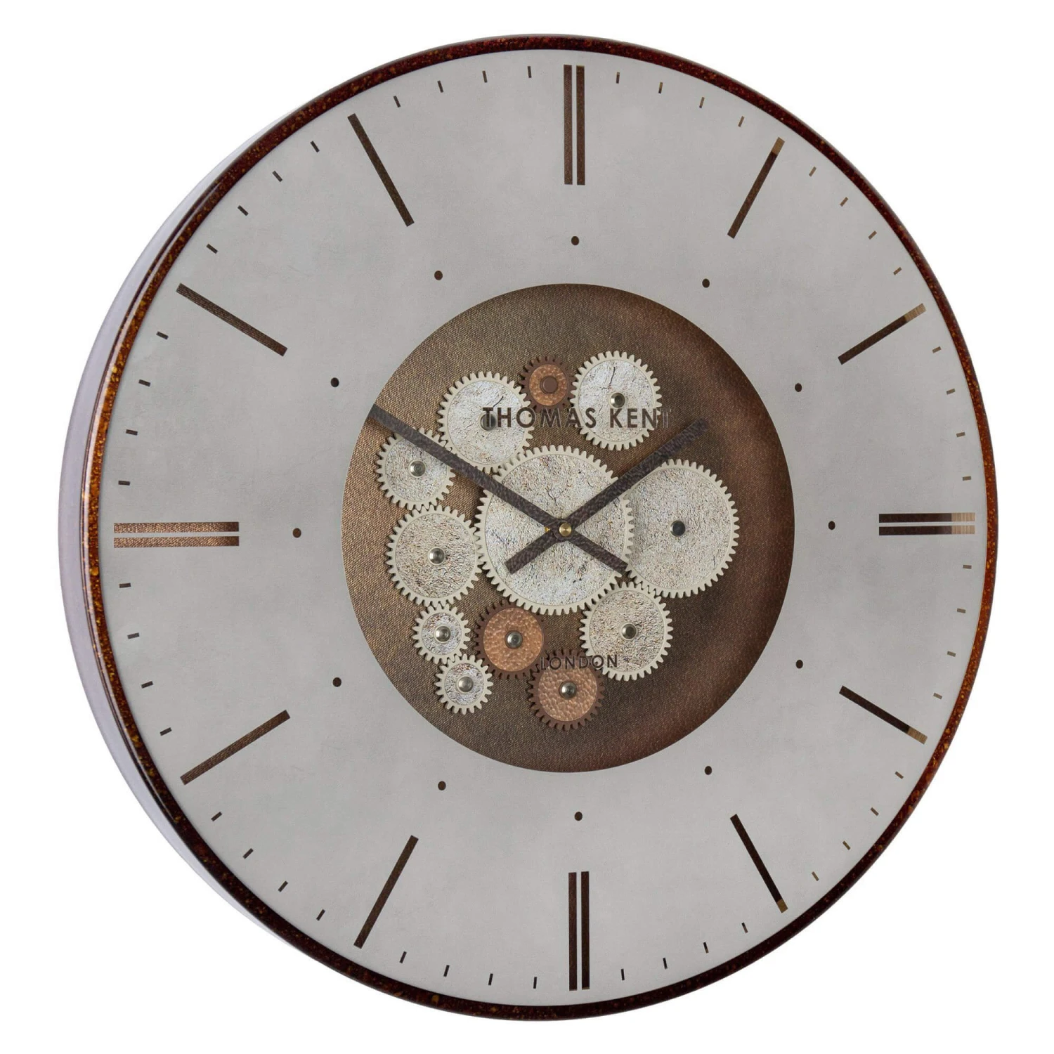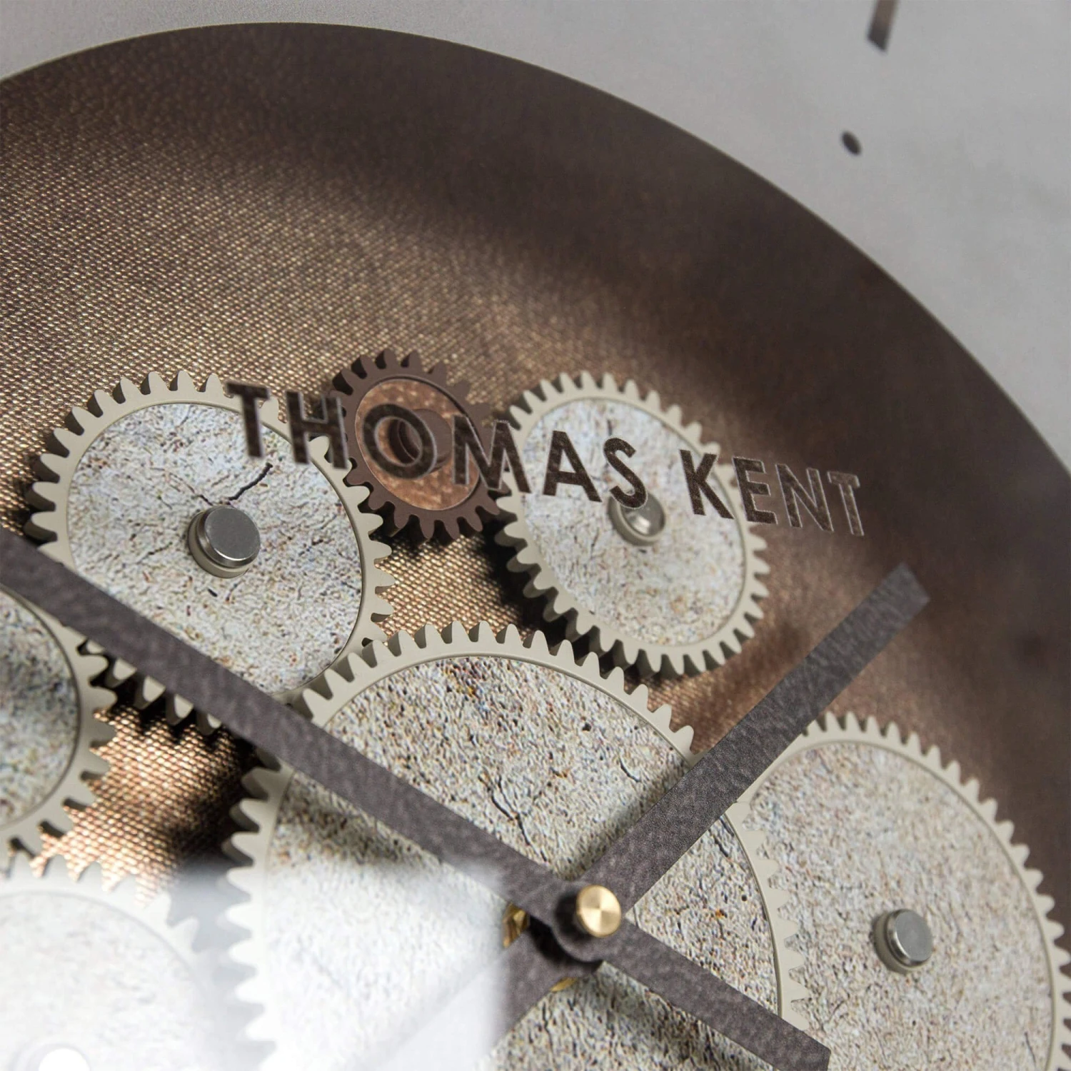 A stunning, large wall clock showcasing industrial features. In the middle of the clock are turning, decorative cogs that gives this wonderful clock a mechanical look. The complimenting metal frame encapsulates the cogs and compliments the stunning centrepiece.