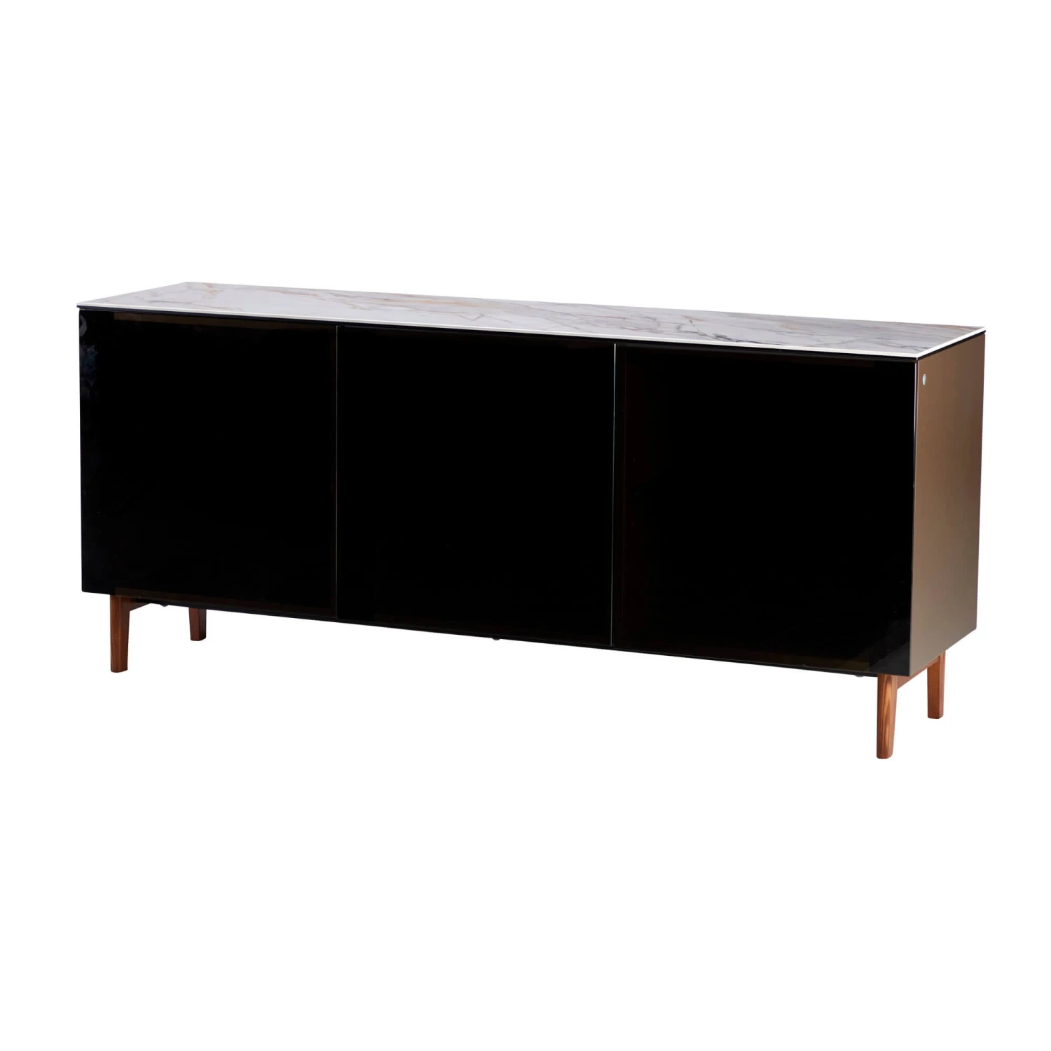 A bold, sophisticated sideboard that features a stunning marble effect top made from a durable bonded ceramic which is easy to clean, and has a strong resilience to scratches, impacts and chemicals. The three tempered glass doors are easy to open to close with just a simple push and are designed to showcase your stunning products stored inside. With strong solid wood legs, it ensures strength and longevity allowing you to elevate your living or dining room for years to come.