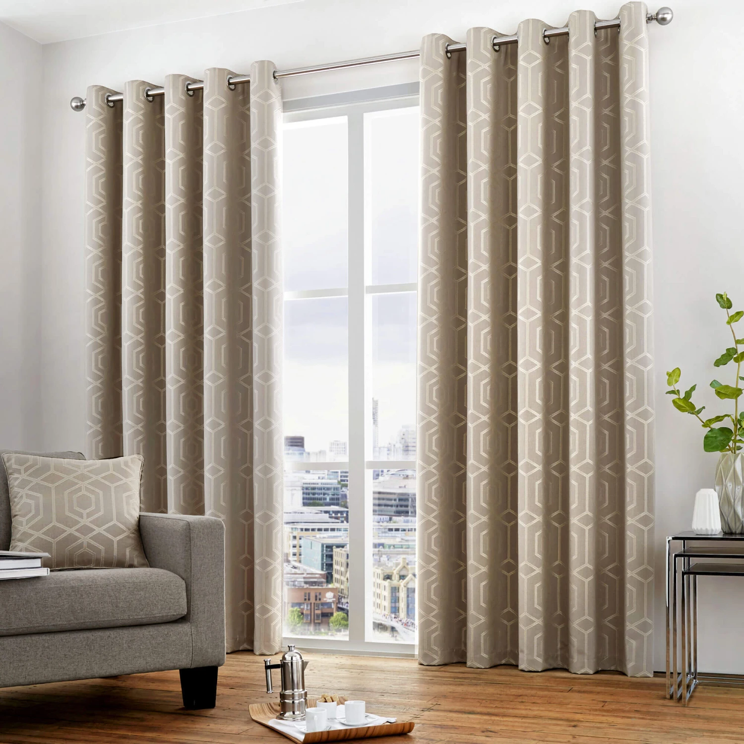 Introduce natural background and modern detailing to your living space with the Camberwell Stone 90″ x 72″ Eyelet Curtains. Crafted from 100% polyester, these stunning curtains feature a dramatic geometric design on a midweight woven jacquard fabric, creating an on-trend look able to complement a variety of colour schemes. Complete with an eyelet heading, these curtains are fully lined, allowing it to provide protection from the sunlight whilst improving insulation. Available in two colours and various sizes, these stylish Camberwell curtains are perfect for adding a glamourous yet timeless touch to any room, making it the ideal setting for any warm and contemporary room layouts.