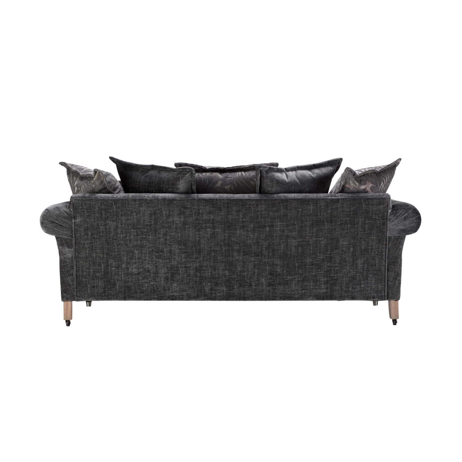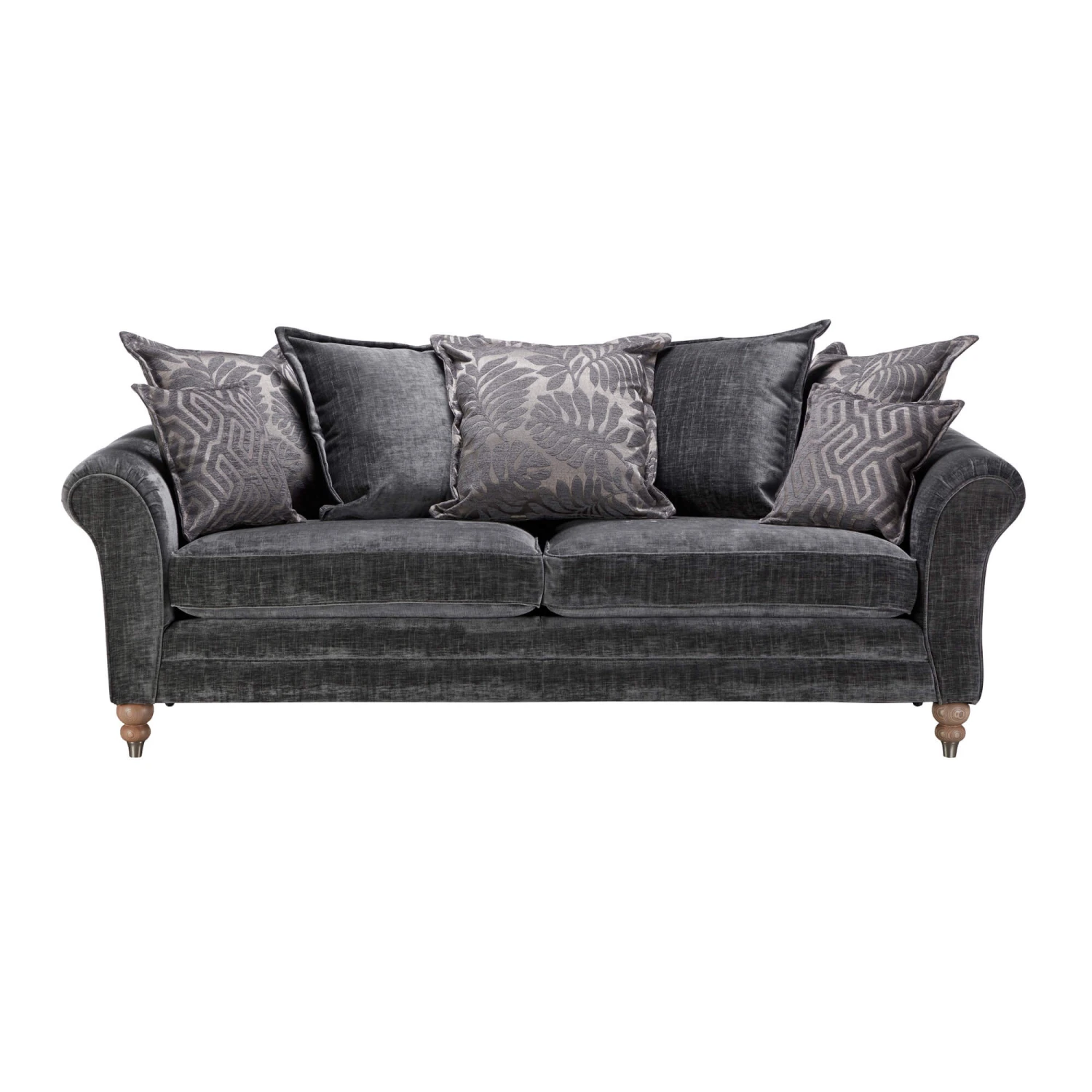 The pillow-back design of the Carolina Grand Sofa offers the ultimate comfort to relax & unwind in, with a luxurious and grand aesthetic. Back cushions upholstered in a mix of fabrics, with geometric patterns and leafy silhouettes, perfectly complement the grey chenille upholstery. Soft pleated scroll arms are a nod to classic design, whilst the carefully hand finished, turned wooden legs in a light grey wash provide the perfect finishing touch.