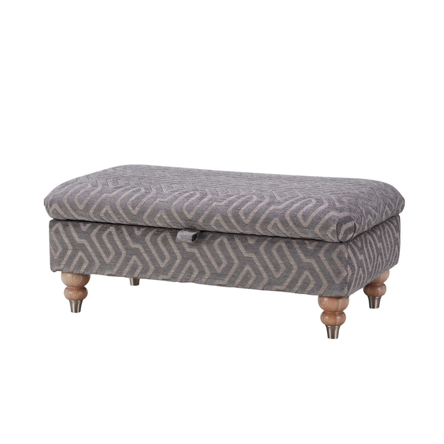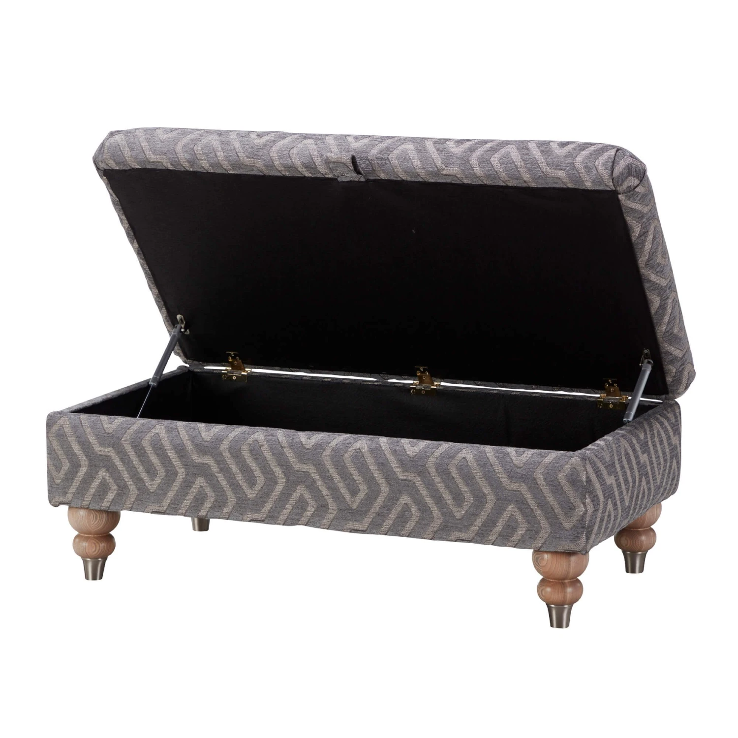 The Carolina Grey Geometric Patterned Fabric Legged Ottoman inherits the hallmarks of high quality detailing, associated with the best of British manufacturing. With a lift-up ottoman design, the Carolina ottoman is the perfect accent piece which offers additional storage space whilst providing a comfortable place to rest your legs at the end of the day. The Carolina Legged Ottoman is upholstered in an eye-catching geometric patterned fabric, enhanced by elegant, light wooden turned legs for a classic look.