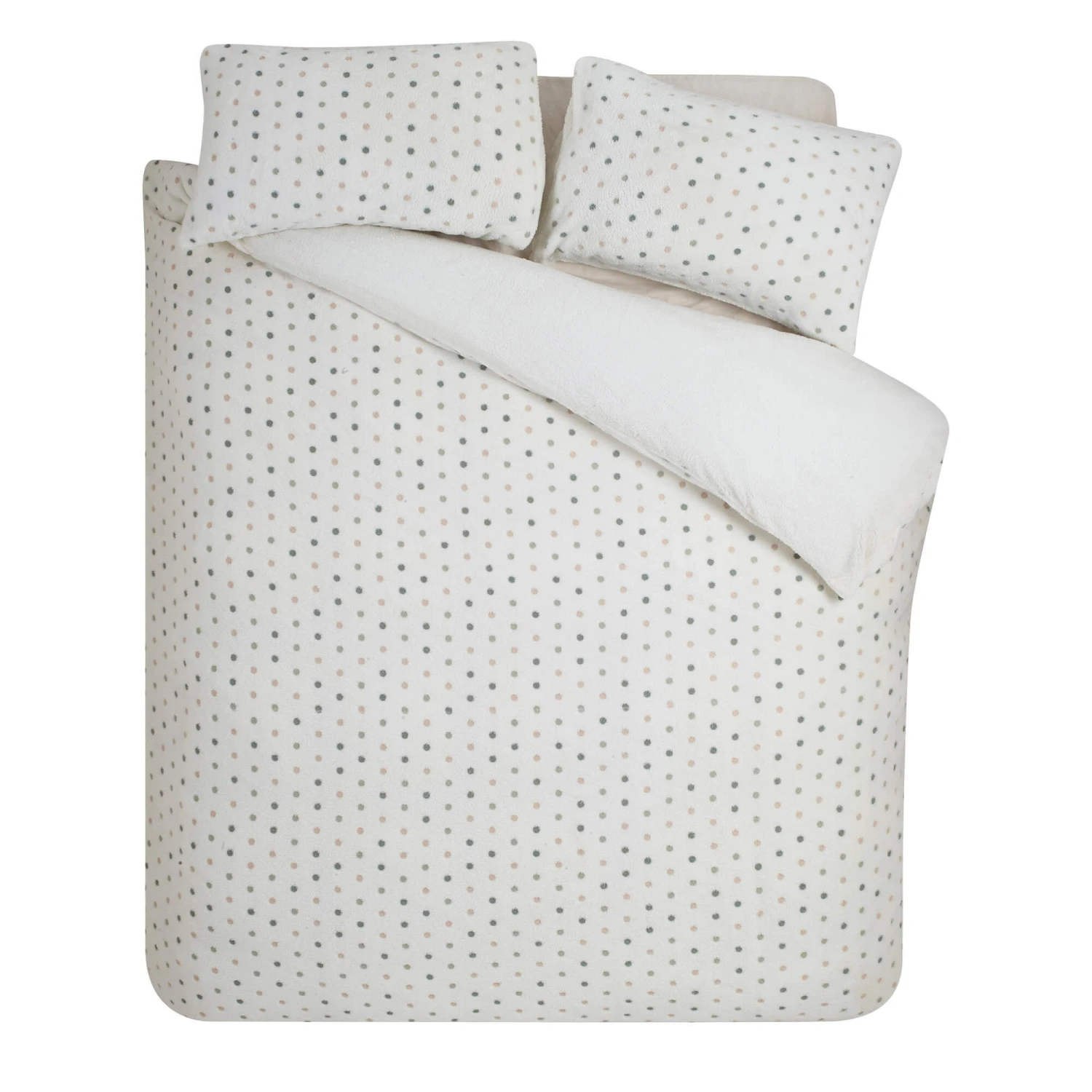 Add a touch of timeless charm to your bedroom with the Cosy Spot Cream Double Duvet Set from Catherine Lansfield. Featuring an embroidered polka dot design on a soft, neutral base, this bedding set brings a subtle yet stylish feel to your bedroom. Crafted from cosy fleece, offering a wonderfully soft and inviting texture, while the plush sherpa reverse provides extra warmth and cosiness, perfect for chilly nights.
