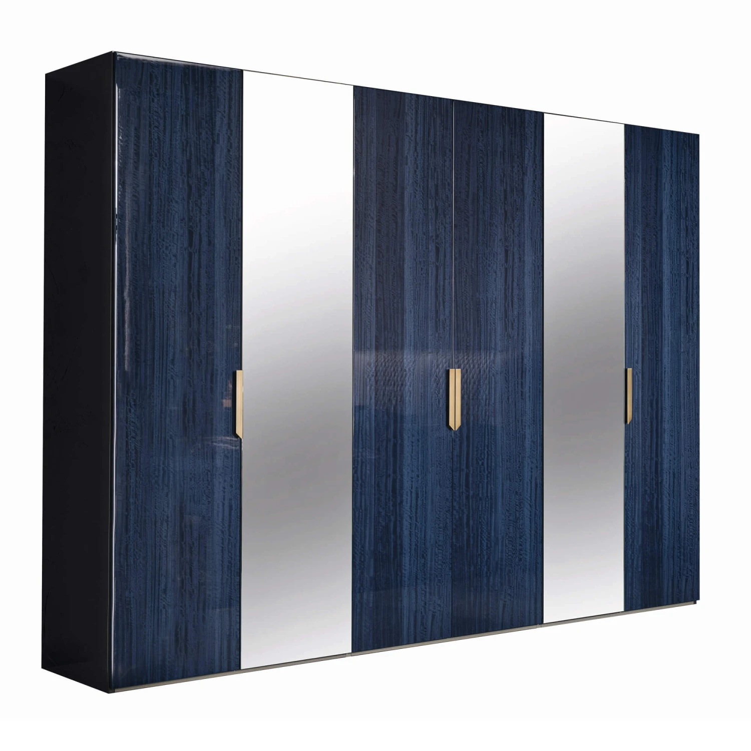 The veneers are made from genuine eucalyptus wood to ensure that no piece is exactly alike and comes with its own, unique look and set of characteristics. A high-gloss lacquered finish creates a lavish, light reflective surface which further elevates the decadent look of this piece, whilst the dark grey body provides a stark contrast to the vivid cobalt blue hue of the door fronts. The stylish geometric design and brushed brass accents create an indulgent, art deco aura, which will enrich any décor by translating a sense of class and timeless sophistication into its surroundings.