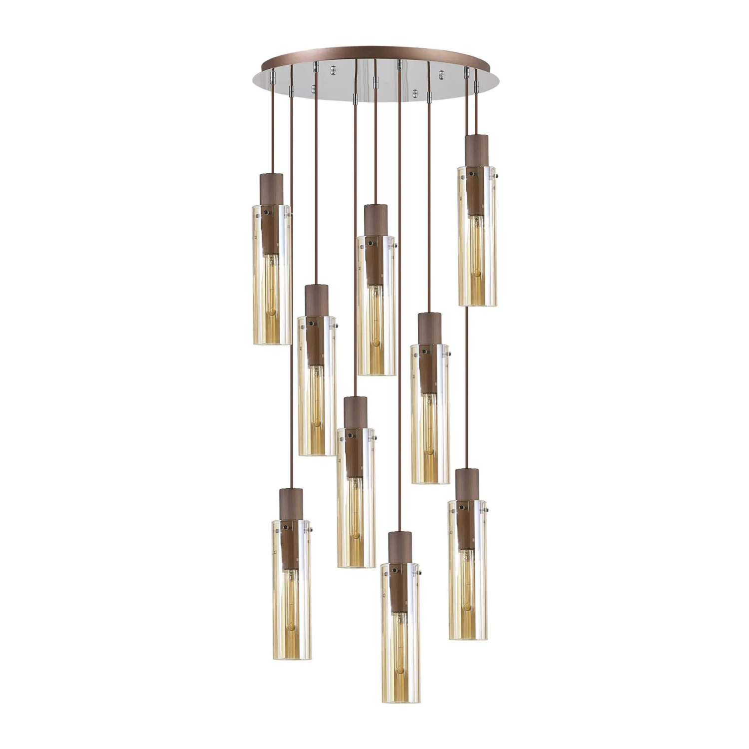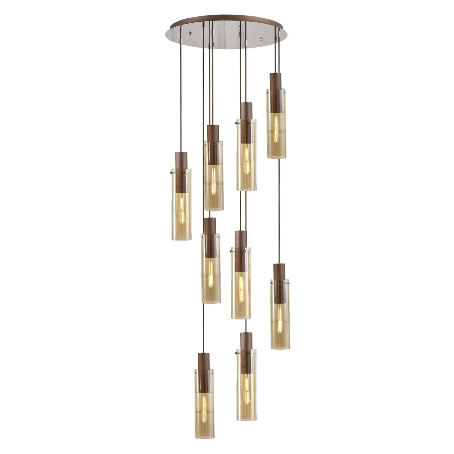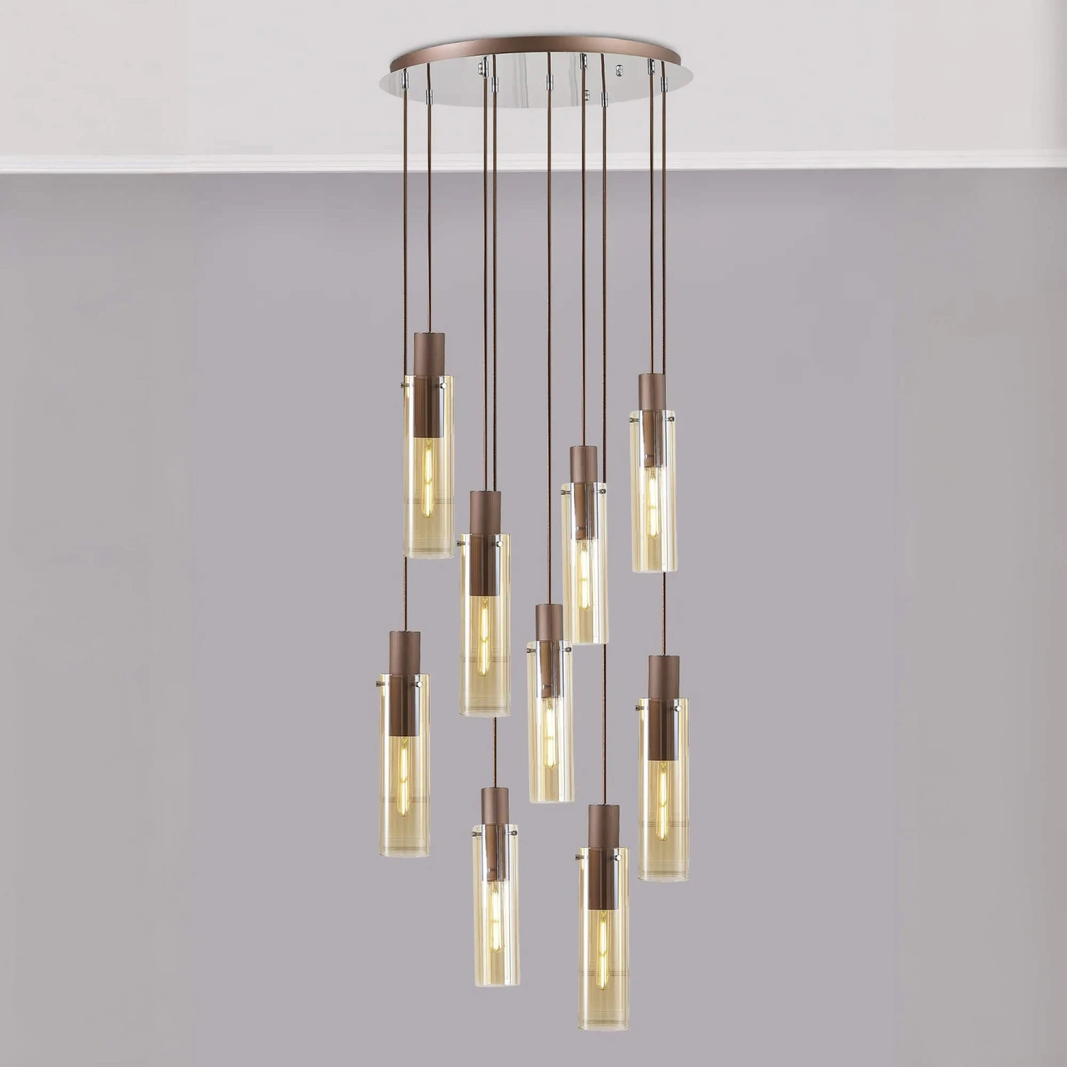 Add a minimal and modern touch to your home with this Chelsea Slim Satin Mocha & Amber 9 Light Pendant. Illuminable by nine E27 LED bulbs, this beautiful pendant light features a mocha finish with a amber ombre effect on nine slim glass cylinder shades, attached to a chrome metal round base, offering versatility with its unique and stylish design. Adjustable in height from 46cm to 296cm, this elegant pendant light is perfect for complementing any modern interior.