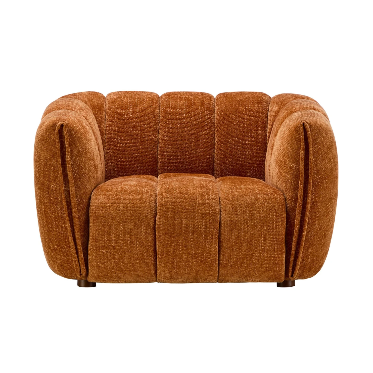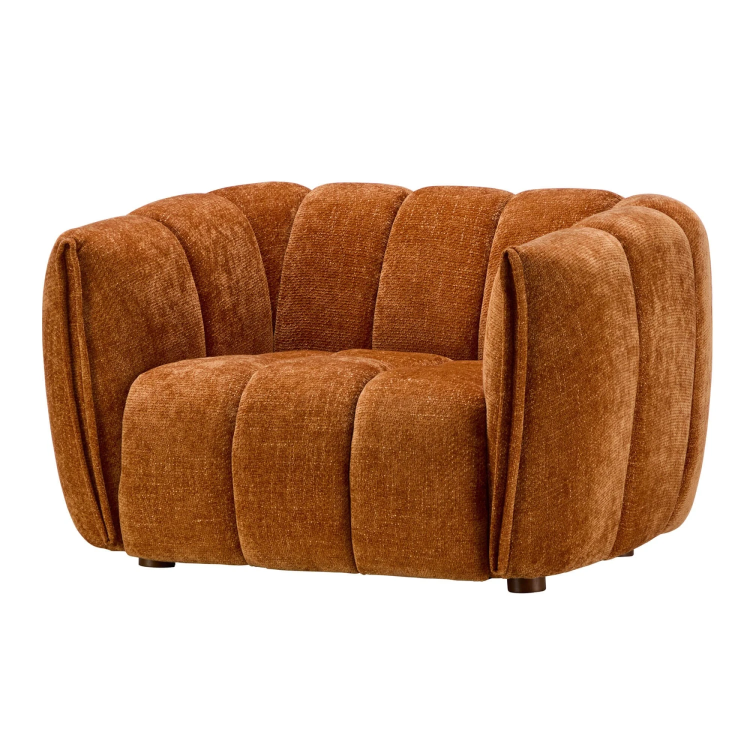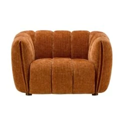 Indulge in ultimate comfort and timeless elegance with the Claudia Rust Orange Fabric Armchair. Upholstered in a rust orange fabric, the Claudia features soft curves, panelled detailing and espresso brown rubberwood legs, creating a super plush and stunning piece.