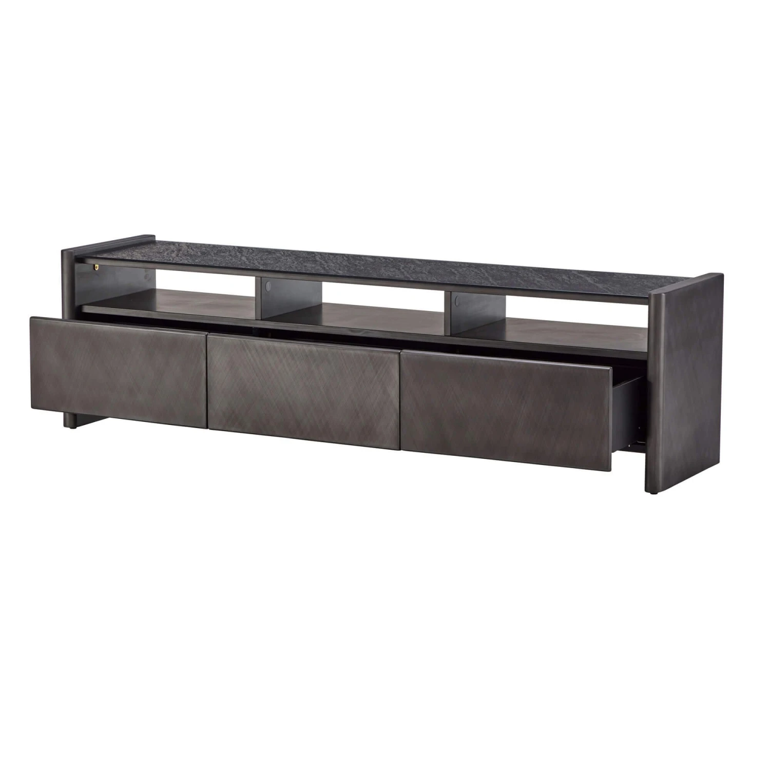 A long 160cm grey TV unit featuring a metallic effect finish which wraps around the unit adding a subtle shine and character. At the top is a glass shelf which features a distinct, worn pattern which compliments the rest of the unit. With 3 handle less doors the unit remains simplistic whilst maintaining the light feel thanks to the open shelves that run inline with the drawer. The edges of the unit are rounded and add to the units overall, well rounded finish. The metallic finish that wraps around the unit has a subtle cross pattern, building on the units charm.