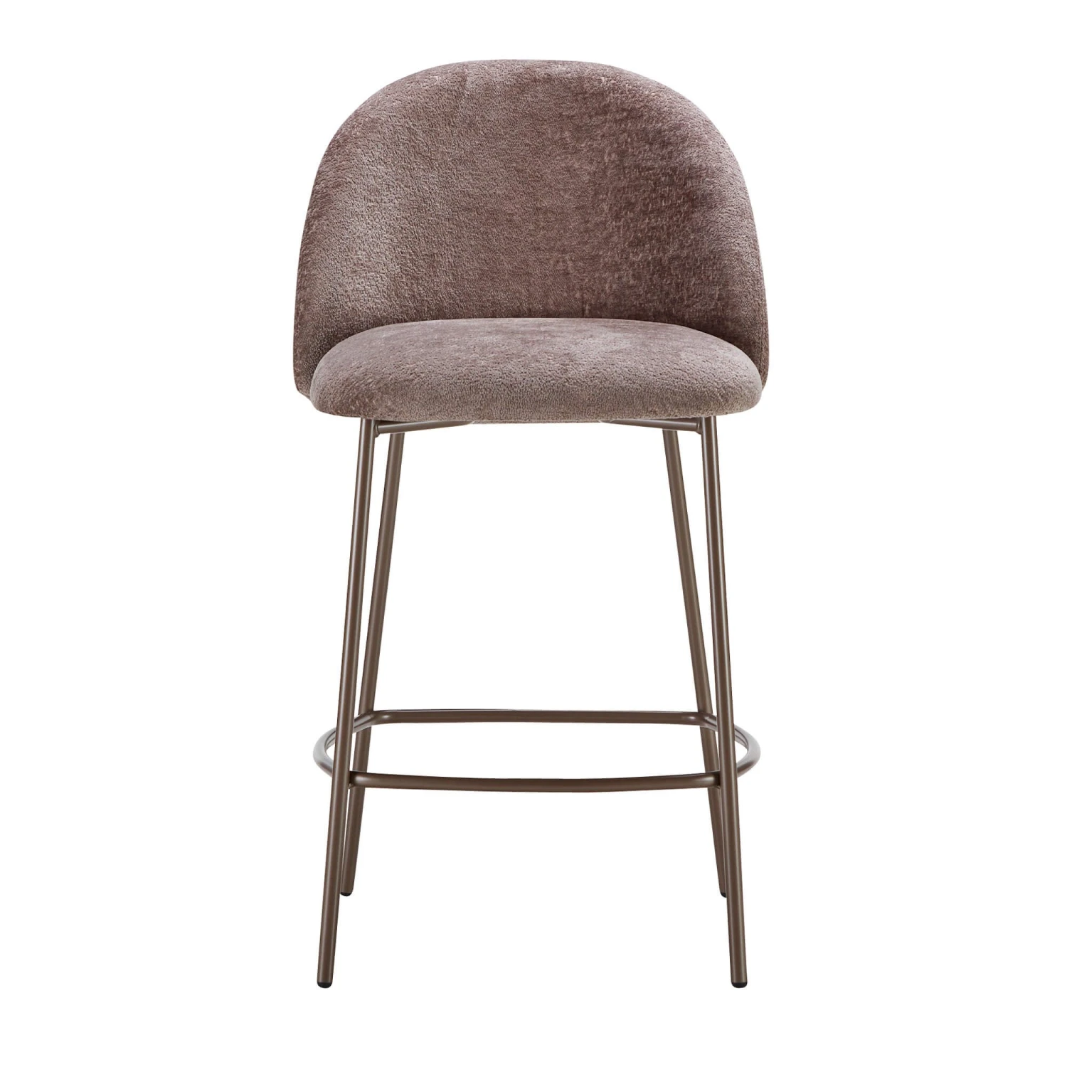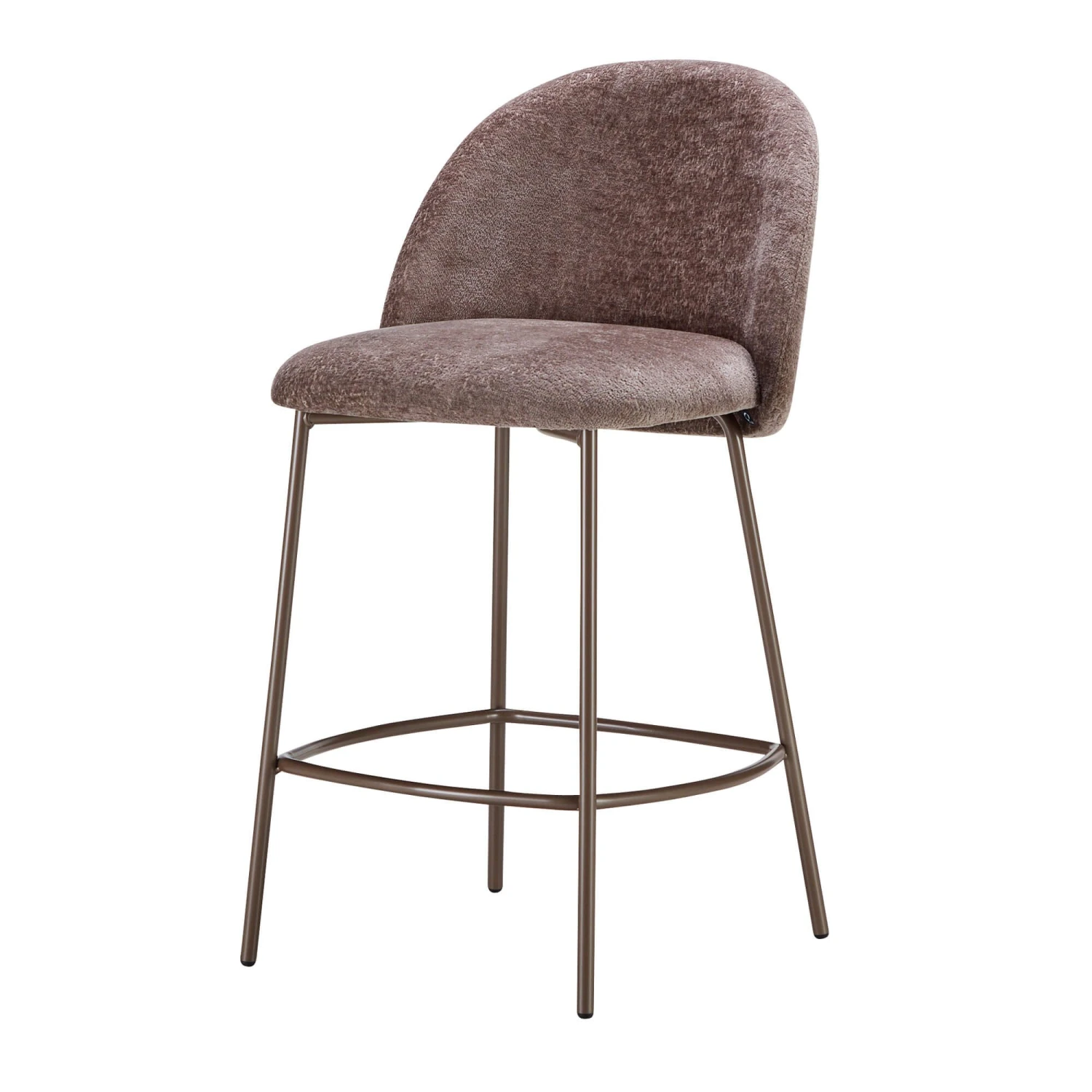 A soft, comforting brown bar stool featuring a contemporary design with a rounded seat and a matching backrest. This chair exudes elegance while offering comfort. The soft brown fabric harmonises beautifully with the brown angled legs, which are reinforced by an oval ring encircling the legs. This design not only enhances the chair’s strength but also ensures its longevity.