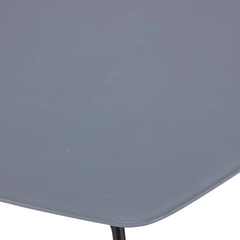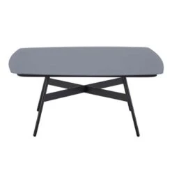 An elegant soft square coffee table with a minimalist style table top and curved edges resting on a four leg base with a cross over design in the centre. The black base contrasts with the slate frost glass table top to become a focal point in your living space.