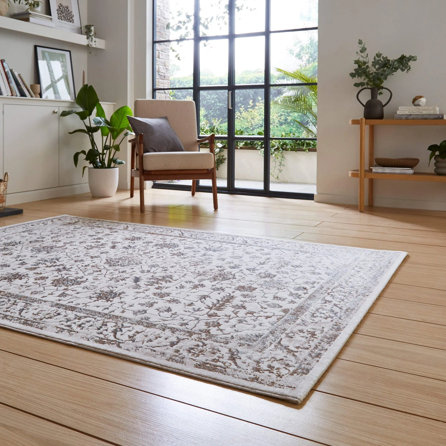 Evoke comfort in any space with a large tasteful rug. The rugs traditional design ensures timeless allure whilst the stunning silver and beige tones create a chic space.