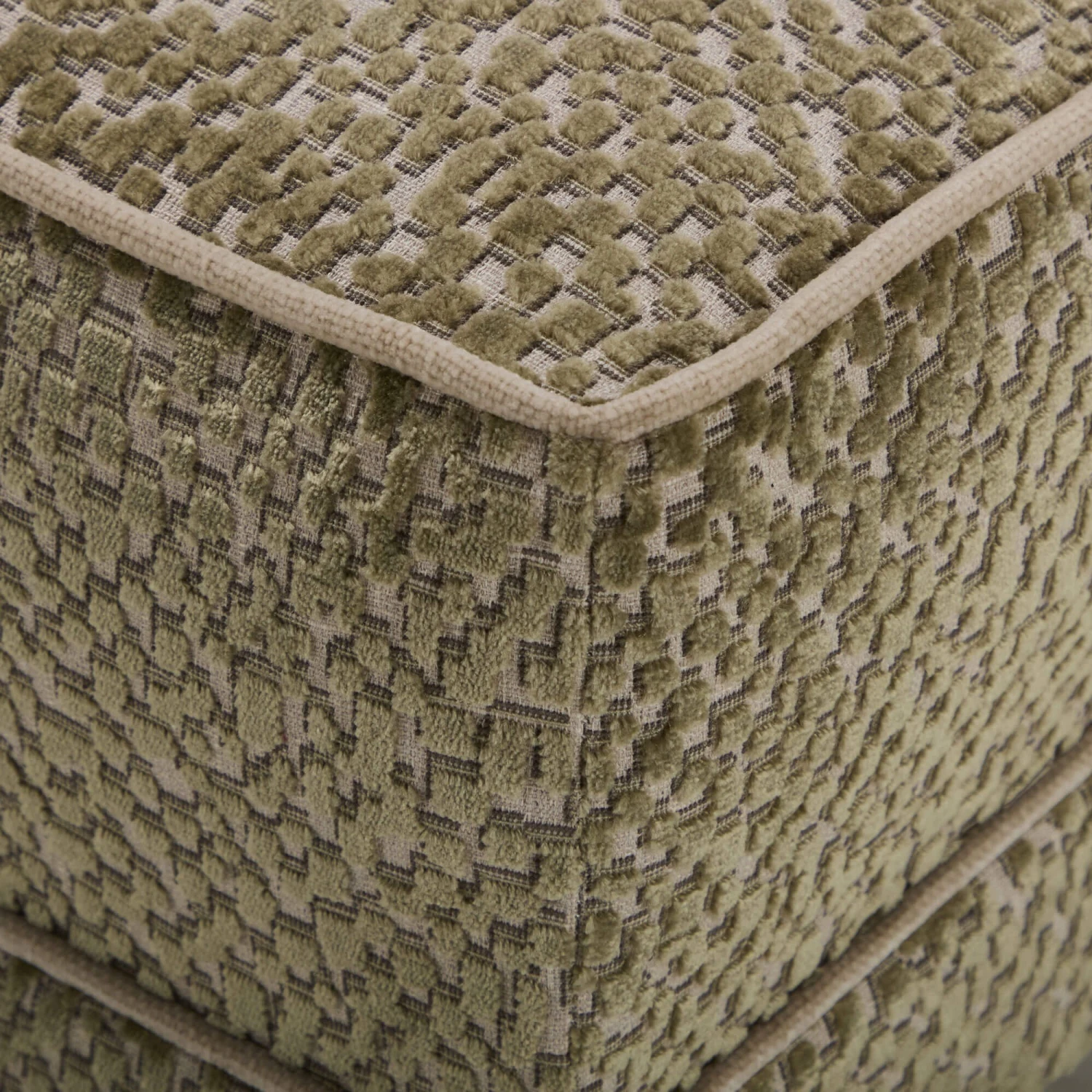 The Hoxton Camino Dot Sage Fabric Footstool by David Gundry blends modern sophistication with timeless quality. Upholstered in a textured patterned Camino dot sage fabric, the Hoxton showcases a square shape with clean, tailored lines, a contrast piping and wenge wooden legs with a chrome metal finish, creating a stylish and sophisticated statement piece.