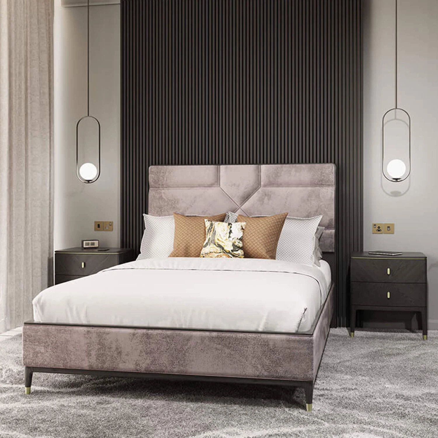 The Davina Ebony 150cm Kingsize Bedframe will bring a distinctive elegance and sophistication feel to your bedroom. Upholstered in a beautiful mottled grey fabric with contemporary panelled detailing to the headboard, the Davina Ebony Kingsize bed frame has been designed to create a striking impression. Slim tapered legs support its streamlined silhouette, whilst a wooden base and gold coloured feet enhance the contemporary look perfectly.