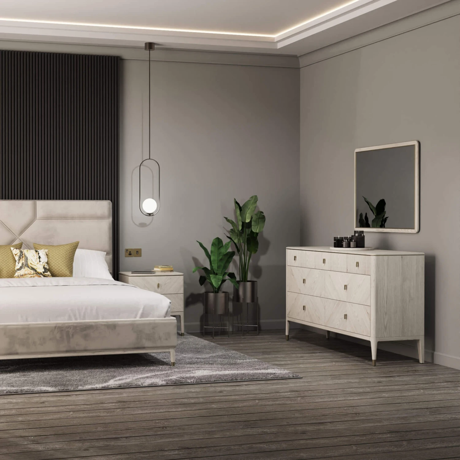 The Davina bedroom collection will bring a distinctive elegance and sophistication to any bedroom. Featuring a beautiful woodgrain effect, with an opulent stone coloured finish and gold handles, this contemporary bedroom range allows you to create a stylish retreat in any home.