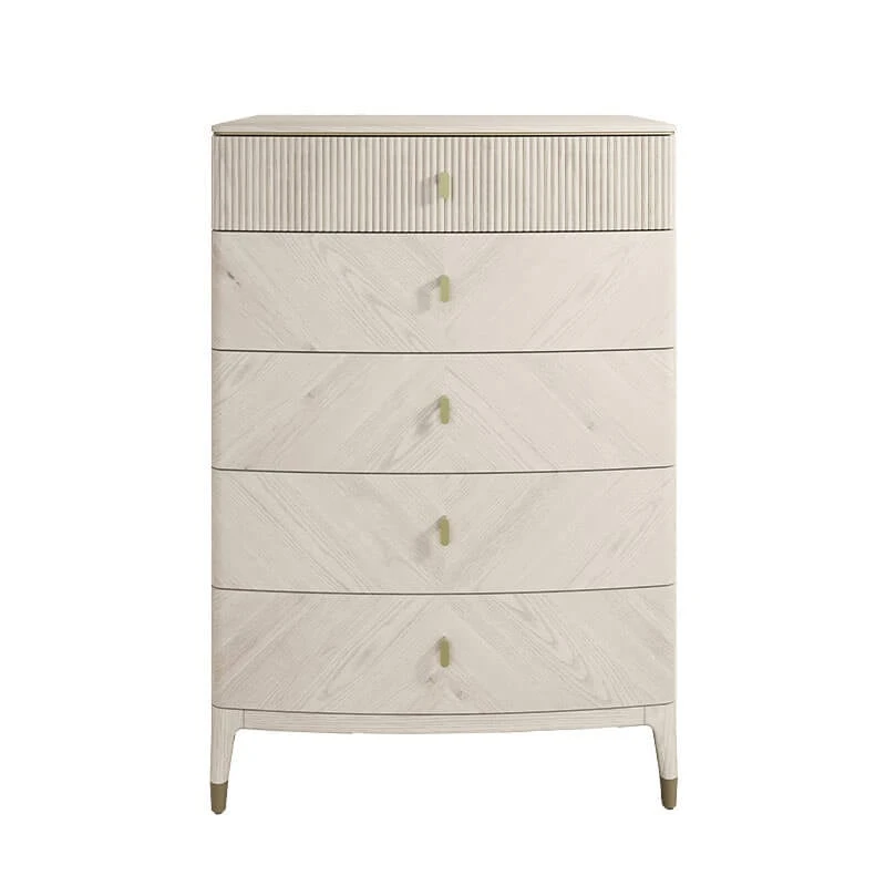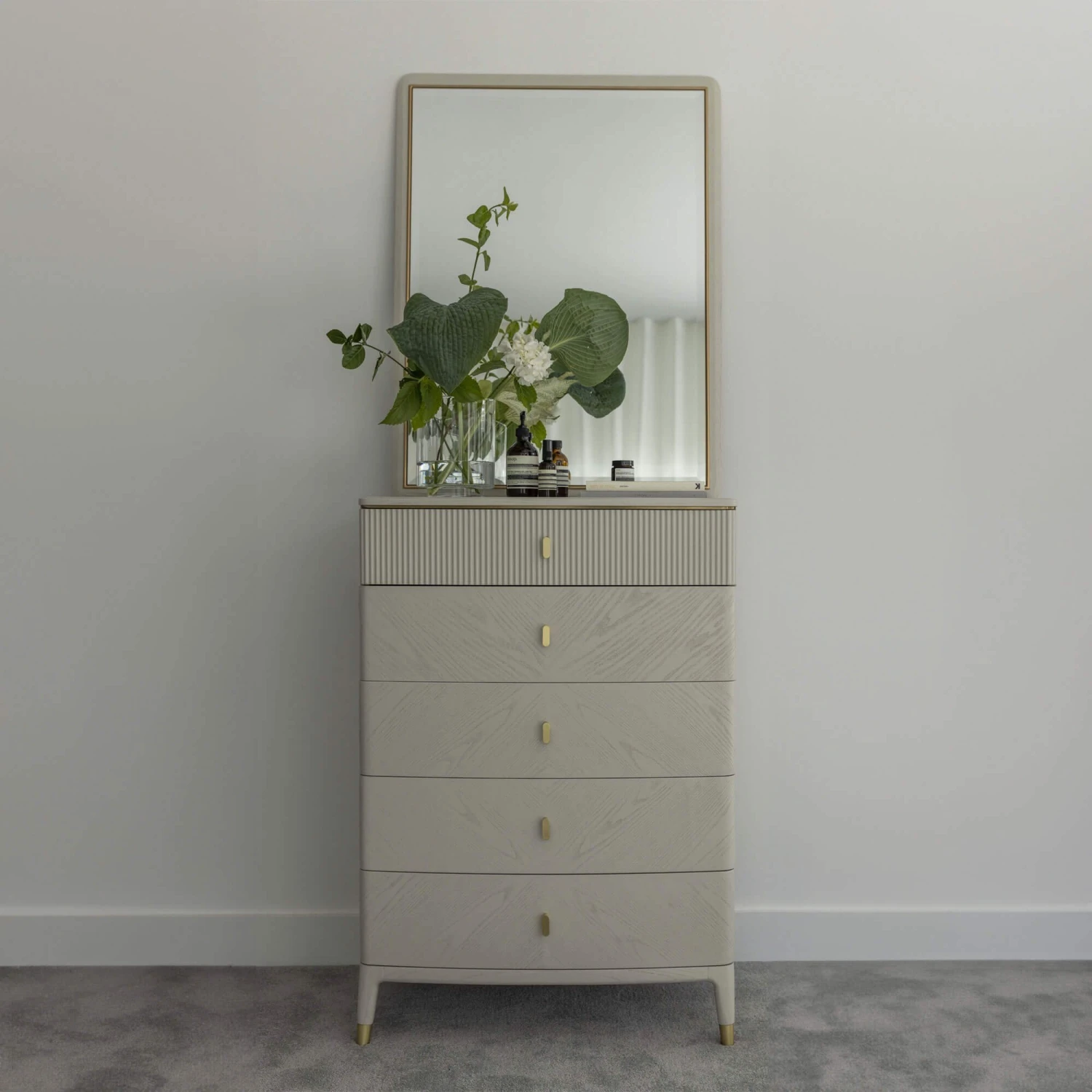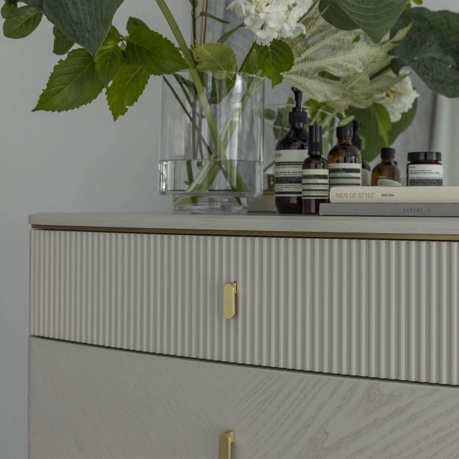Slim tapered legs create a streamlined silhouette, with gold coloured feet enhancing the contemporary look perfectly. A gold coloured inlay around the furniture tops adds a striking finish touch, whilst selected drawer fronts feature a ridged paneling effect for the ultimate unique and contemporary aesthetic.