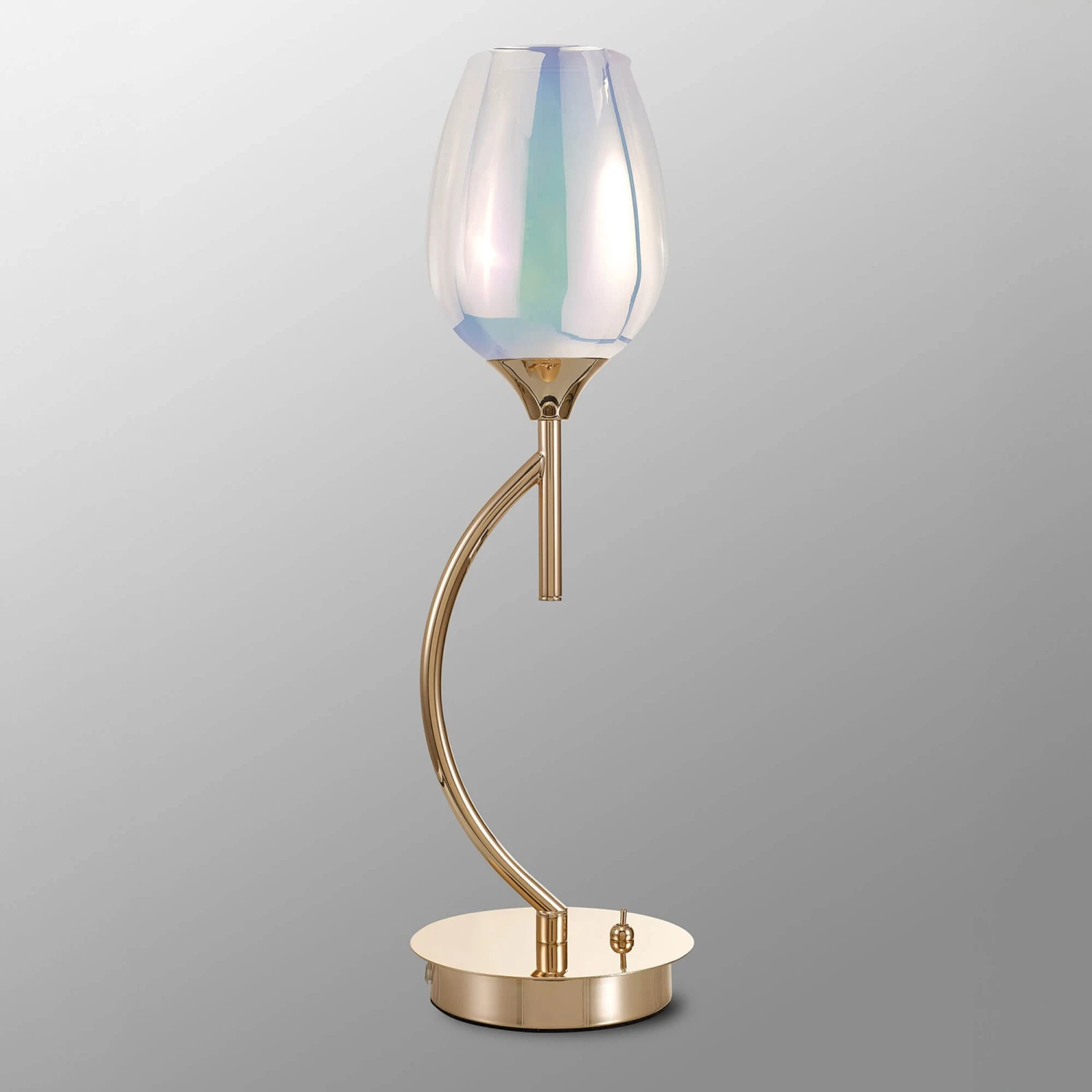 Offering a combination of unique and contemporary design, the Delia French Gold Table Lamp features a beautiful wine glass shade in an iridescent colour. Brought together on a gold base, the lamp adds luxury and style to an interior, whilst providing a warm glow.