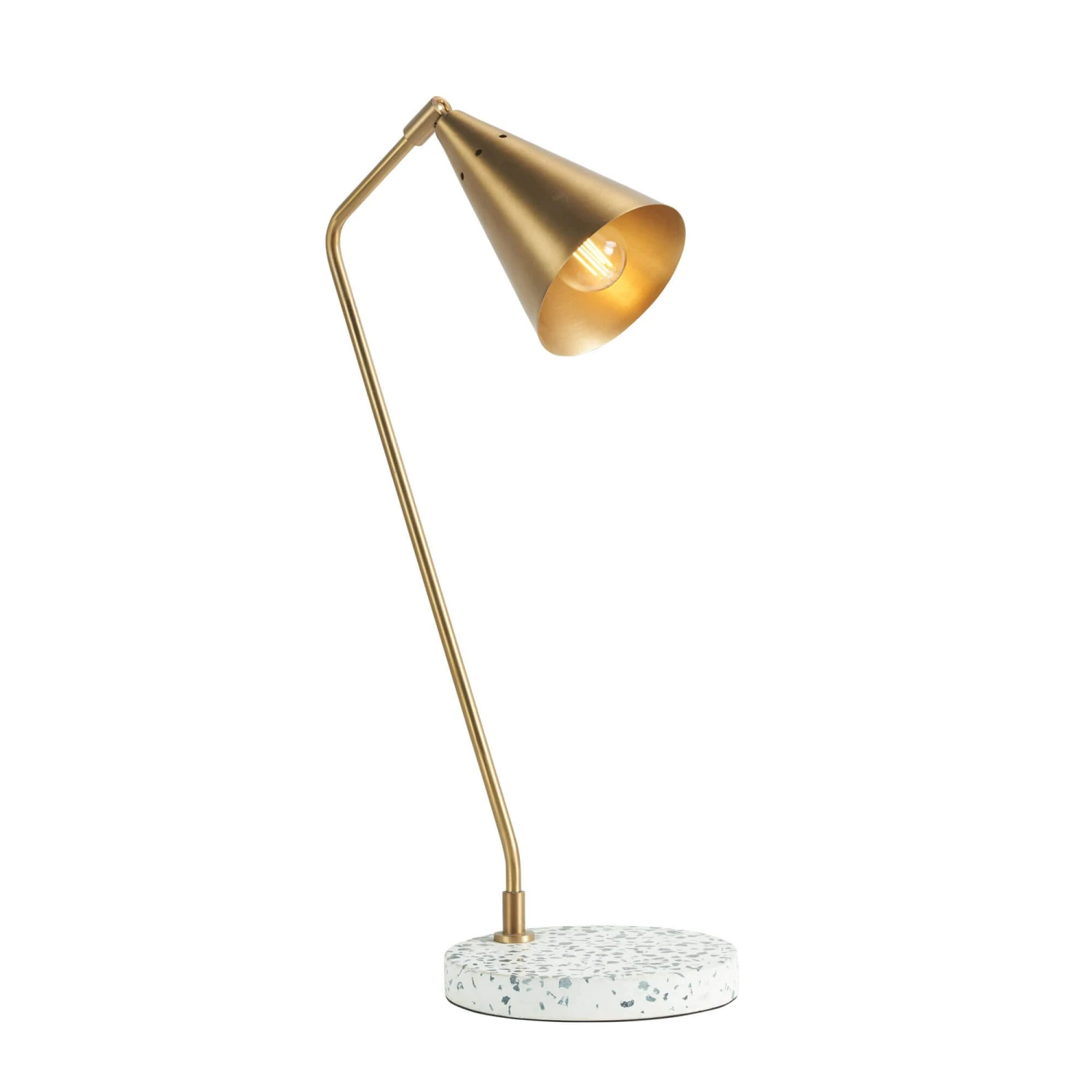 Add a unique and elegant touch to your home office with this Pavonazzo Brushed Brass & White Terrazzo Desk Lamp from Designer Guild. Illuminable by a required E27 bulb, this stunning desk lamp features an evocative cone shaped brushed brass shade and stem with a round terrazzo base with chips in green and grey hues, providing a warm and inviting ambient glow. Crafted in India, this sophisticated desk lamp will make a contemporary statement and look fantastic in any room.