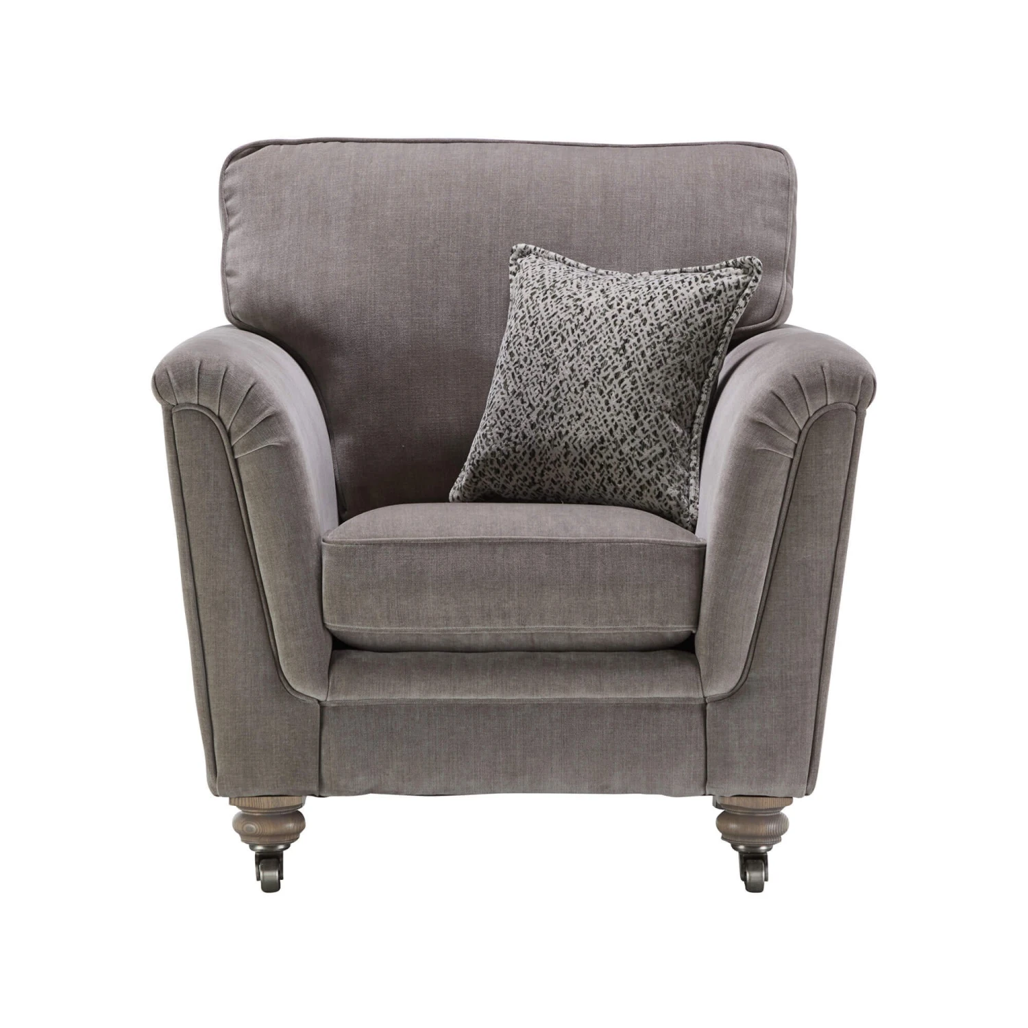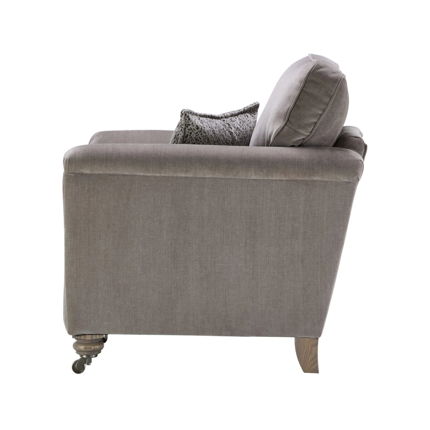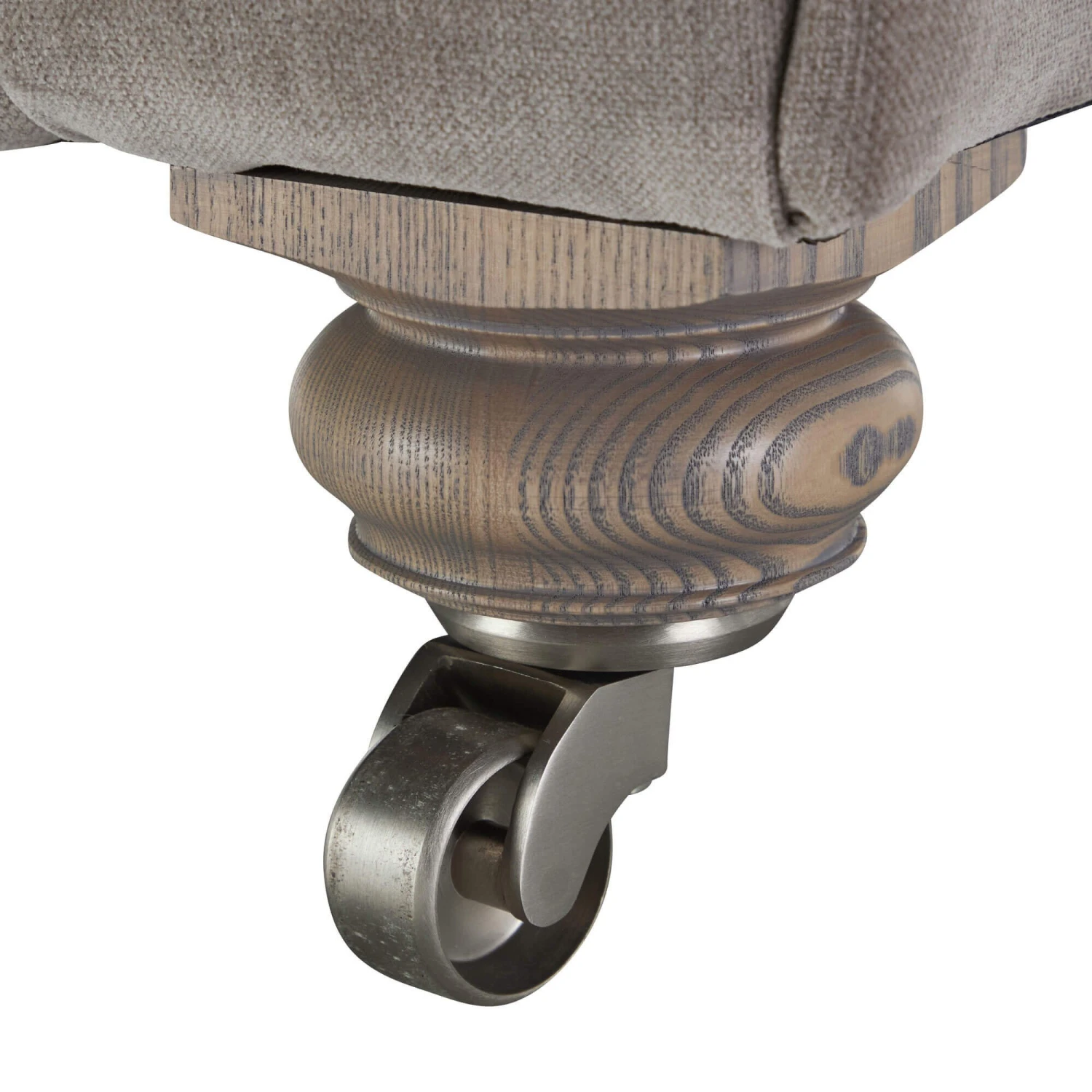 Upholstered in a grey fabric, the Donna has an elegant silhouette with flowing lines, well-proportioned arms blending sophistication with timeless design and antique ash wooden legs with satin nickel metal castors.