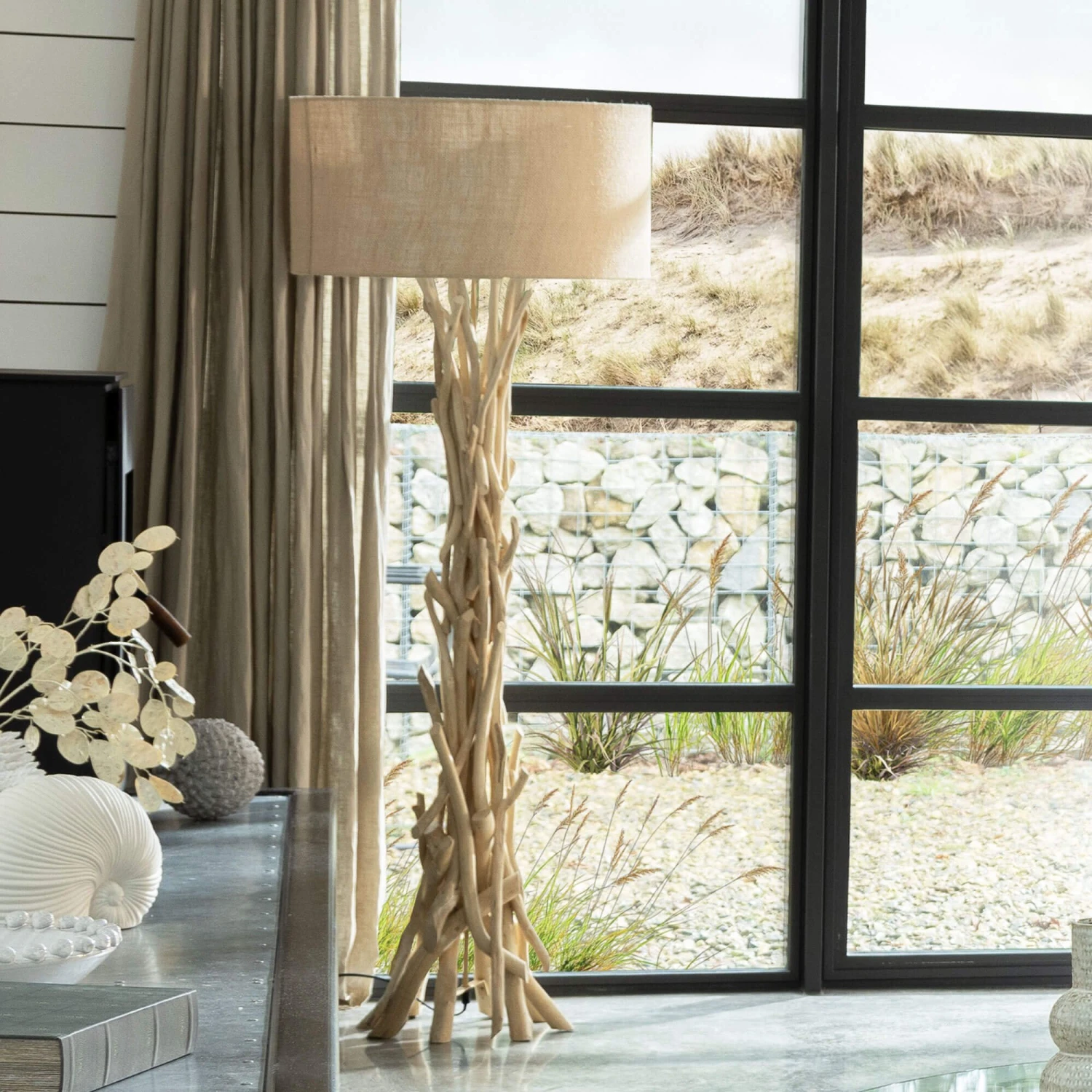 Bring the outdoors indoors with this Driftwood Floor Lamp With Natural Jute Shade. Illuminable by an E27 LED bulb, this elegant floor lamp features a natural jute shade with a beachcomber inspired driftwood base, formed through the interweaving of branches to create a real tree trunk appearance, able to provide a warm and cosy ambience to your home. Operated by a black foot switch, this unique floor lamp will enhance any room and is perfect for adding a sophisticated and organic touch to any contemporary décor with its natural colours and design.