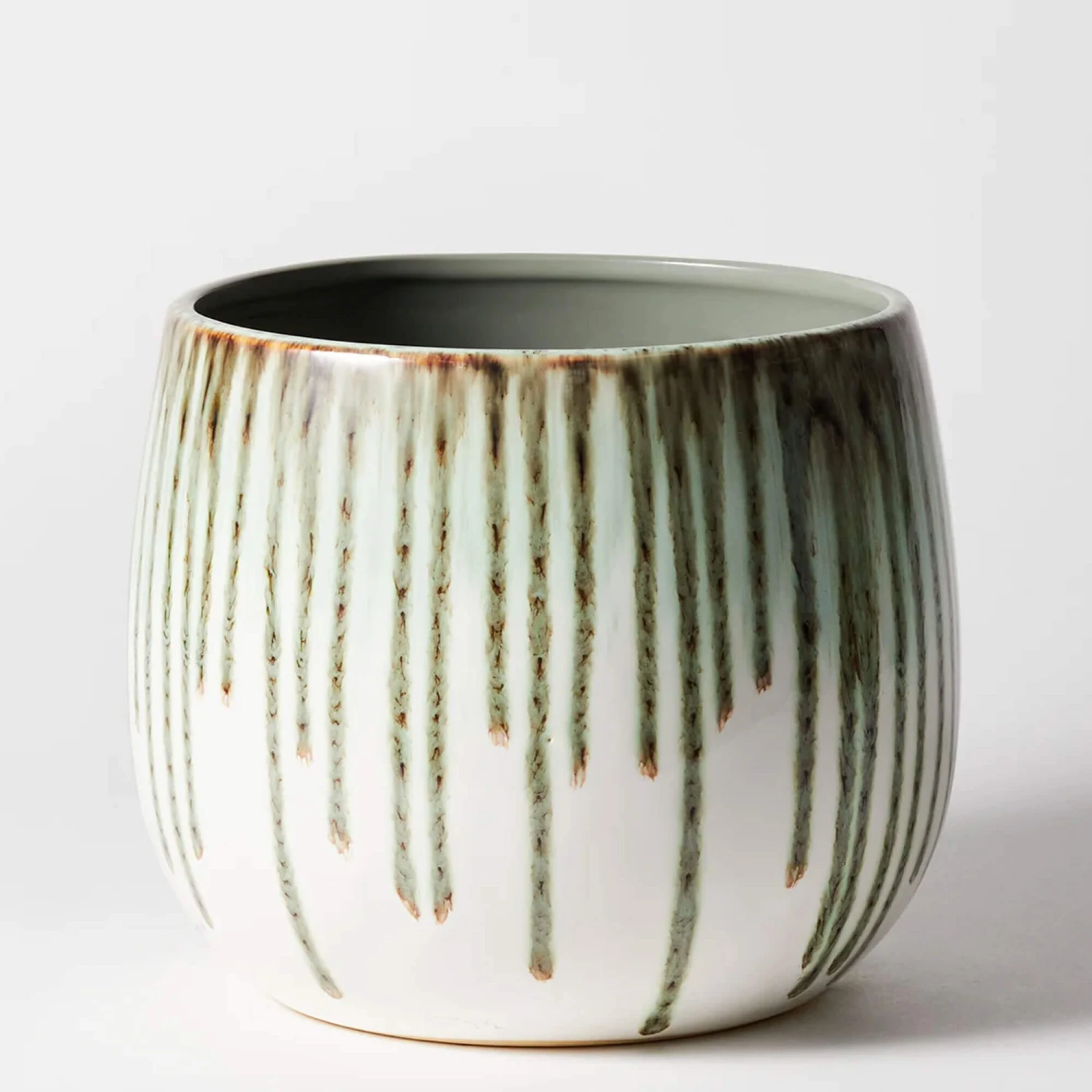 This Drops Large Green Planter is a simple but effective item at adding a contemporary look to your room. The planter can hold a plant on the floor or a table but will also look equally as good being empty as a decorative piece. The planter is a white colour with a green droplet like design flowing down the sides.