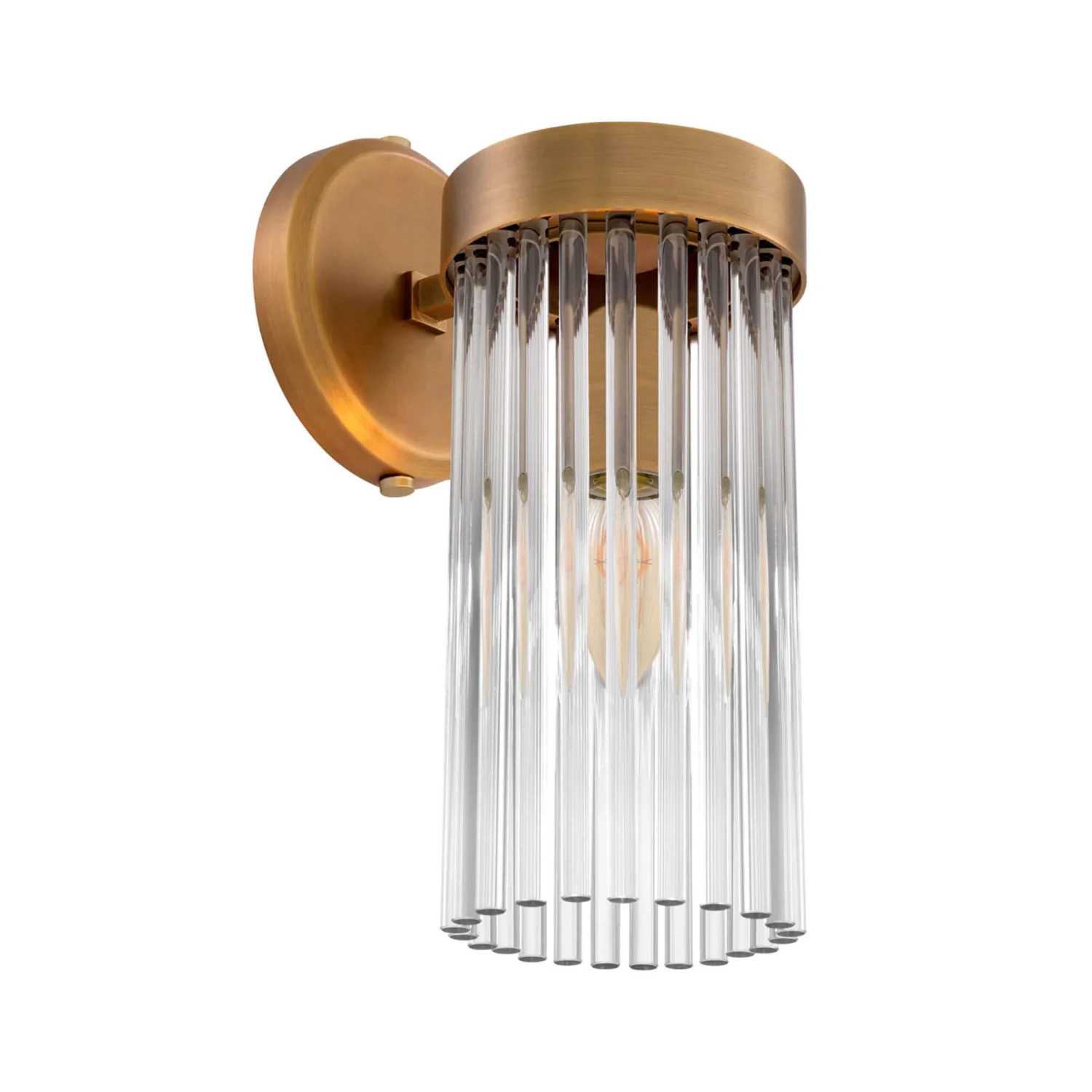 The Carnero Antique Brass Wall Lamp by Eichholtz channels the glamorous Art Deco style. Illuminable by a required E14 bulb, this captivating wall lamp features a round antique brass fixture with a shade made up of numerous beautiful strings of clear glass rods in a long cylinder shape, creating a stunning effect when the light shines through. Vintage yet stylish in design, this magnificent wall lamp will enhance any space with its unique and eye-catching appearance, making it perfect placed in any traditional or contemporary interior.