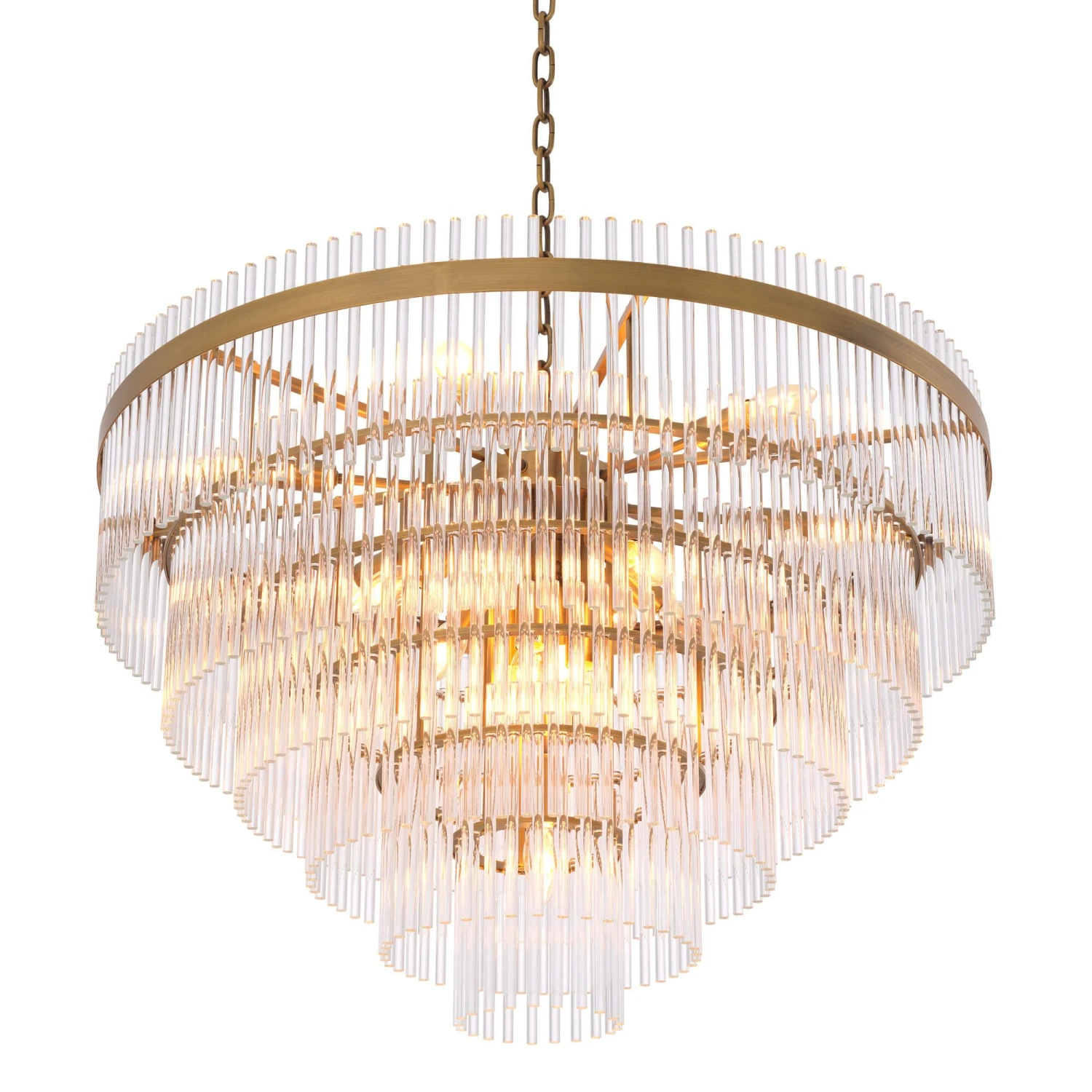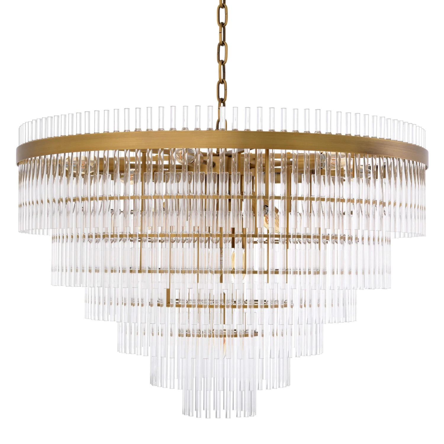 The exquisite East Single 7 tired chandelier by Eichholtz is a true masterpiece of lighting design. The stunning chandelier is encircled with 429 pieces of clear glass rods that catch the light in a mesmerizing way, creating a warm and inviting glow that will enhance any room. Crafted with antique brass framework, the East Single chandelier exudes elegance and sophistication.