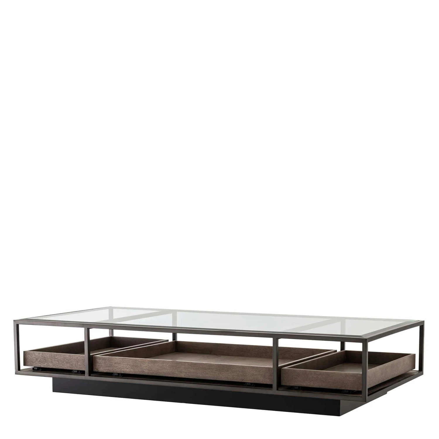Create a striking look in your living room with this hand crafted by skilled artisans display box style coffee table featuring three grey veneer pull-out drawers on rails making your magazines and remotes easily accessible while always clearly visible through the glass top resting on a bronze finish frame.
