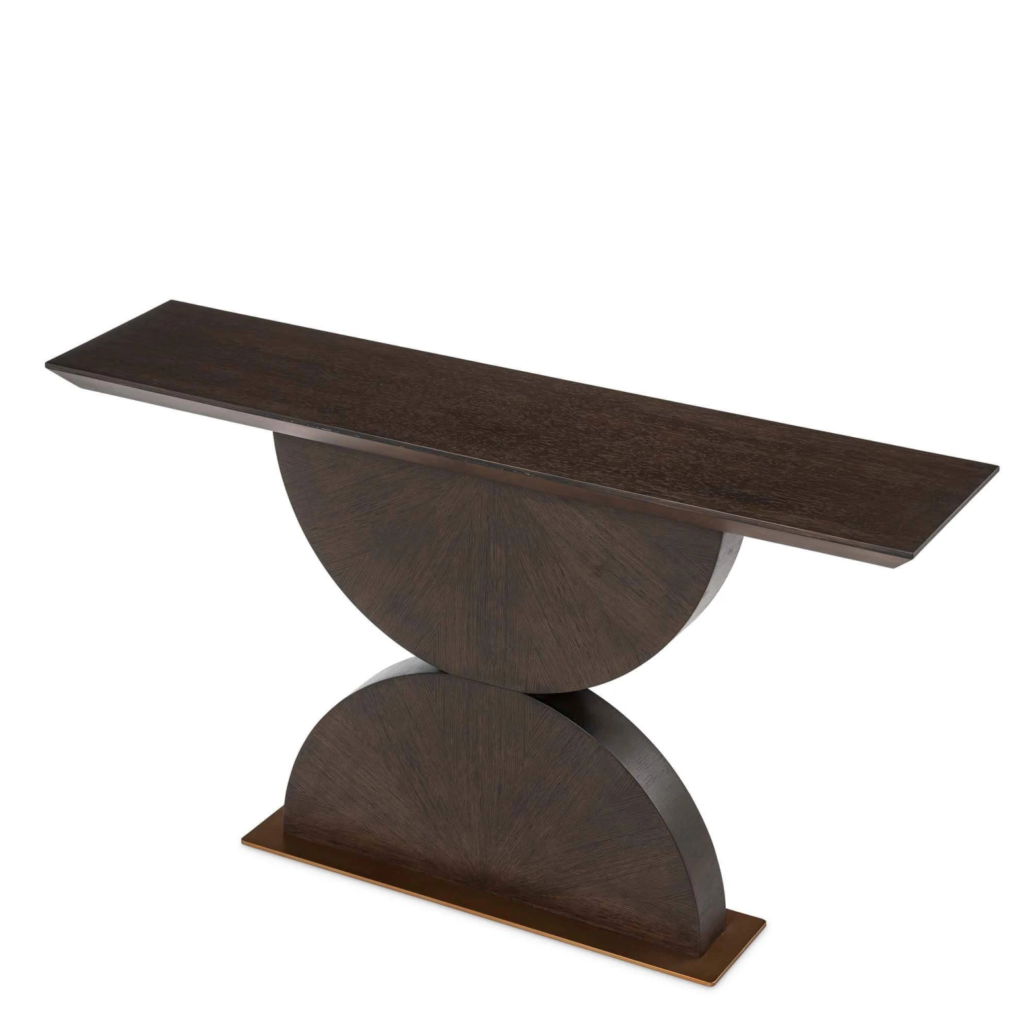 This spring mocha oak console table is hand crafted by skilled artisans made from oak veneer features a slim table top with a tall curved stand all resting on a thin brushed brass finish base. Consoles perfect for in a hall way or living space as a statement piece on its own that can also be styled with accessories.