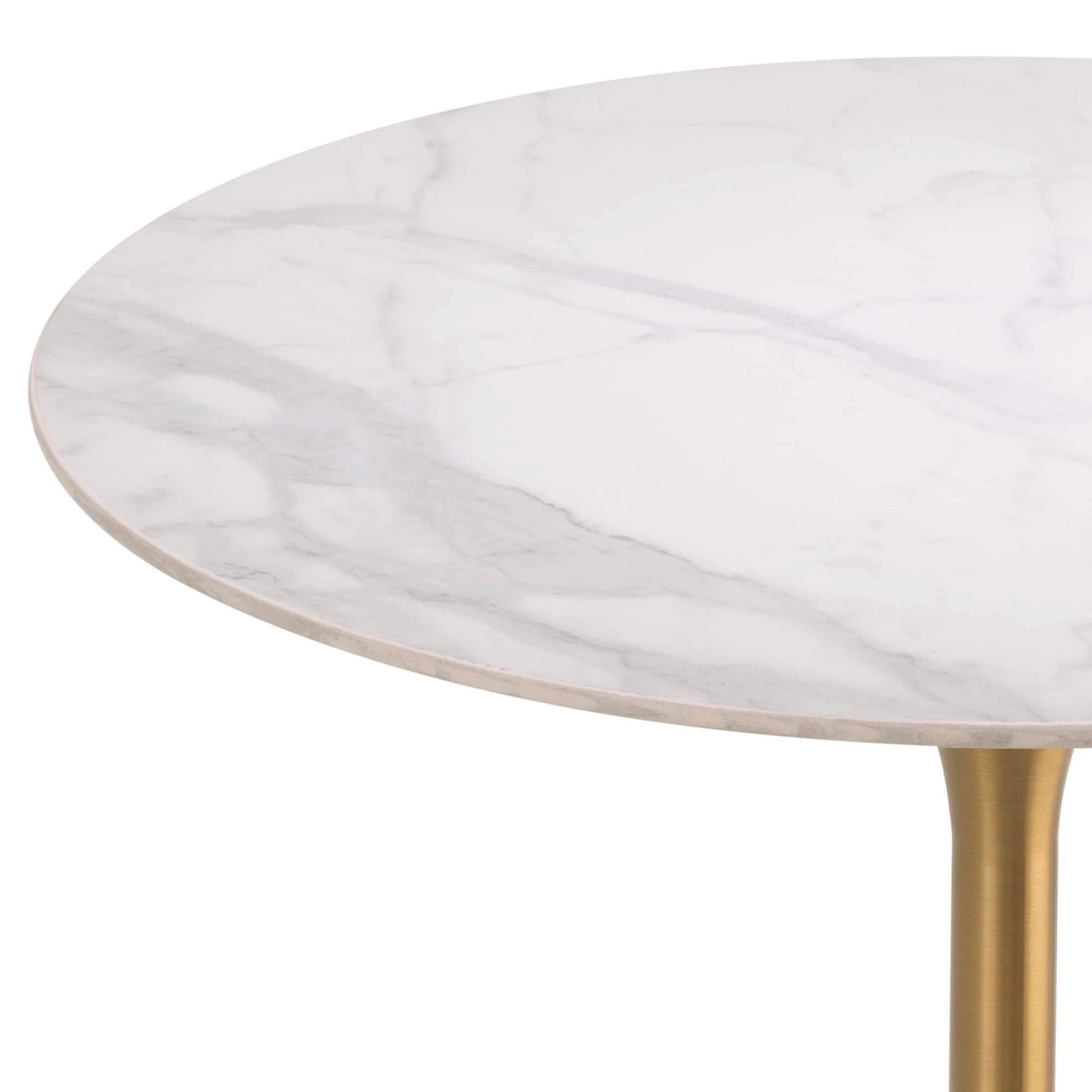 A classic standing café table perfect for small spaces, to create a breakfast nook or to compliment your very own bar. Handcrafted with a circular ceramic marble effect top and brushed brass finish featuring a marble effect design delicately placed on a slim brushed brass column fanning out on both side in a trumpet style.