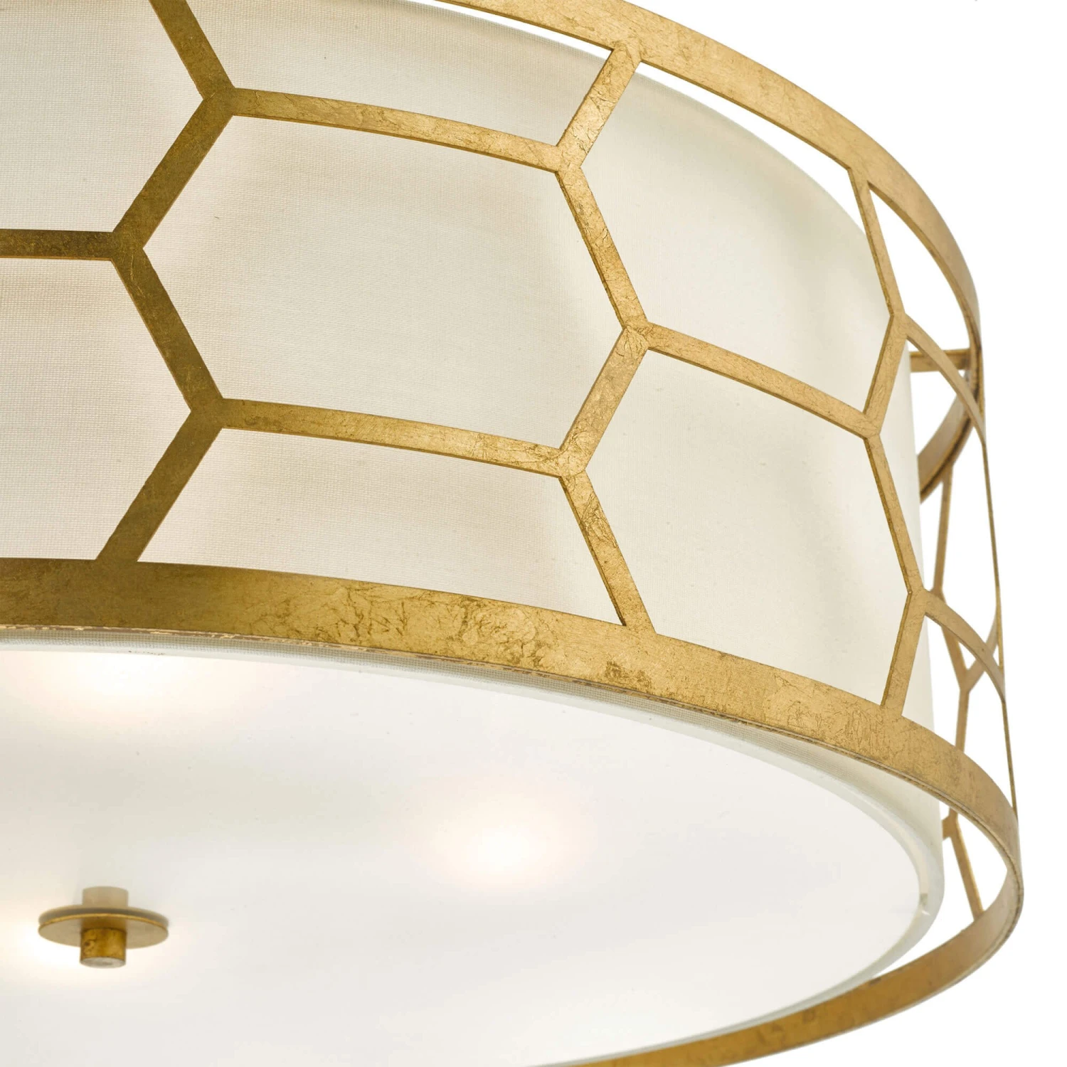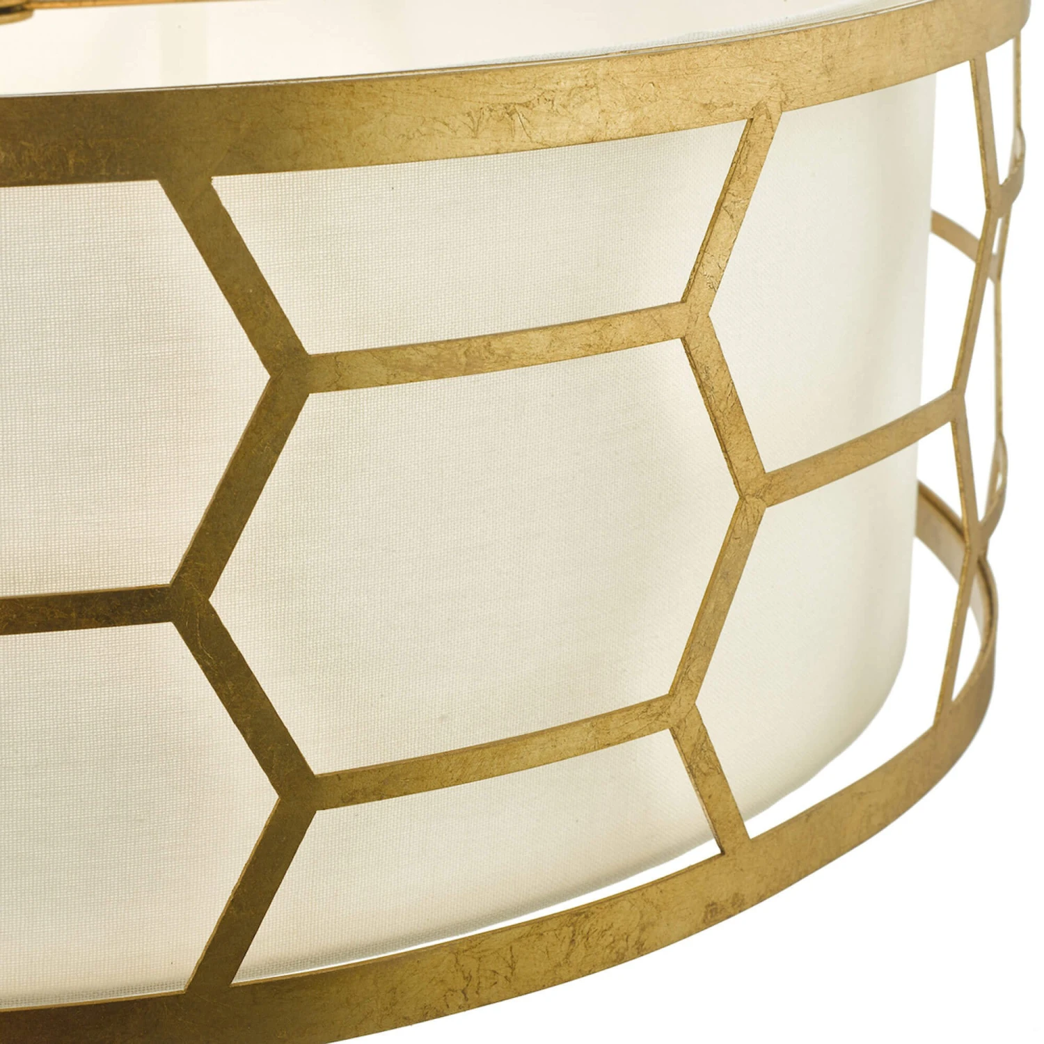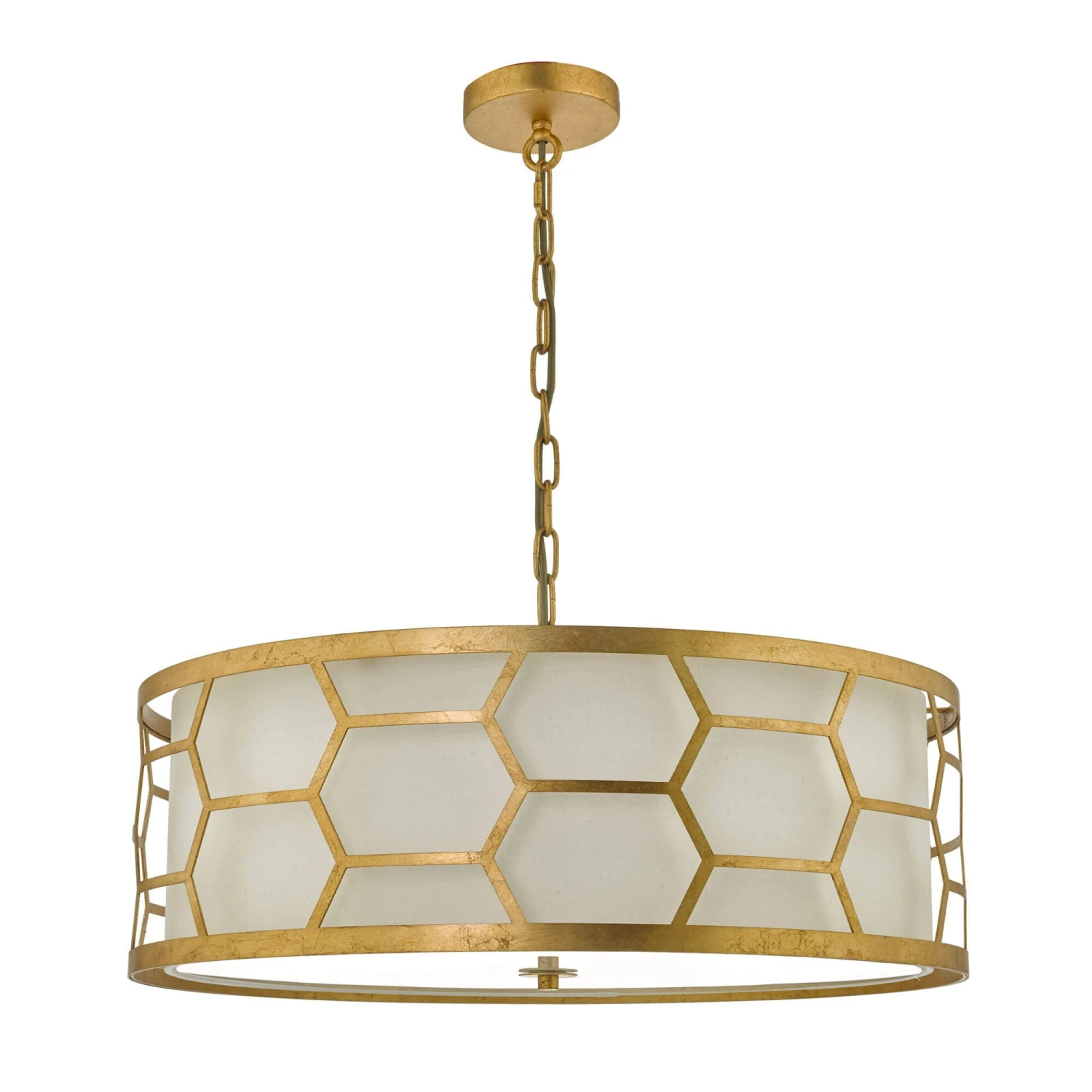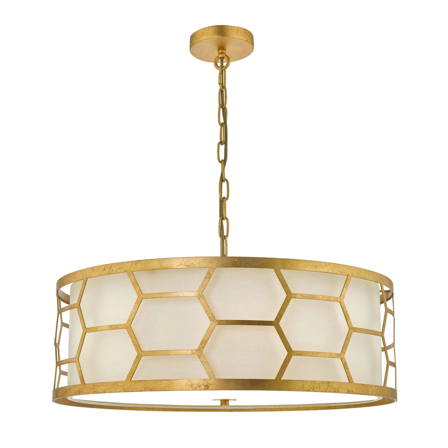 The Epstein Gold & Ivory 4 Light Pendant transcends beauty. Illuminable by four E27 LED bulbs, this gorgeous pendant light features a ivory linen shade within a hand applied, distressed gold leaf finish geometric patterned frame on a gold metal base, allowing the light to softly shine through. Adjustable in height upon installation from 35cm to 190cm, this stunning pendant light is complete with a frosted tempered glass diffuser and is perfect placed in your bedroom or above tables, to add a unique and elegant touch.