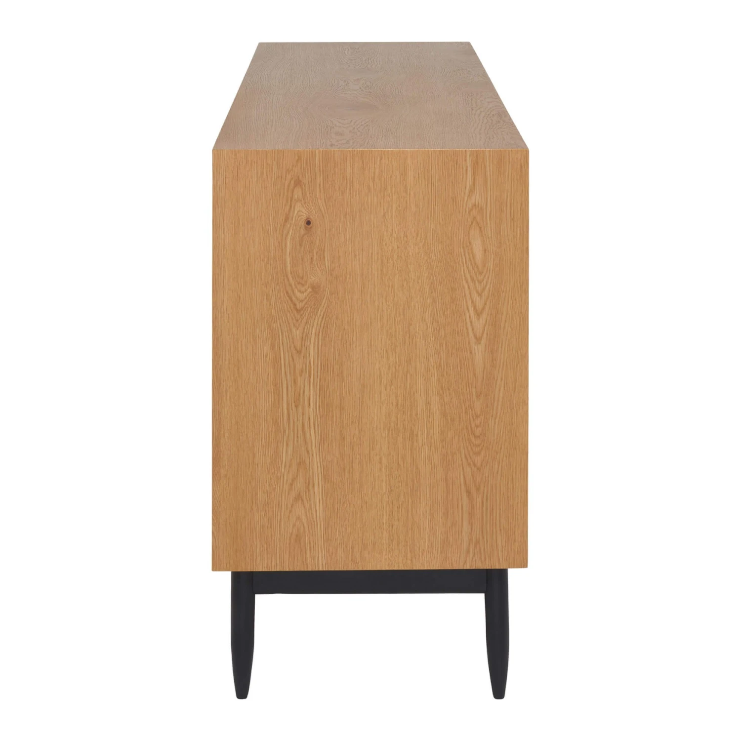 The smooth, matte black finish of the oak plinth and base contrasts the natural textured grain and appearance of the brushed, solid oak and veneer carcass beautifully, whilst the subtle, herringbone oak veneer panel on the door fronts makes a unique, decorative feature and really emphasises the character and tactility of the wood.