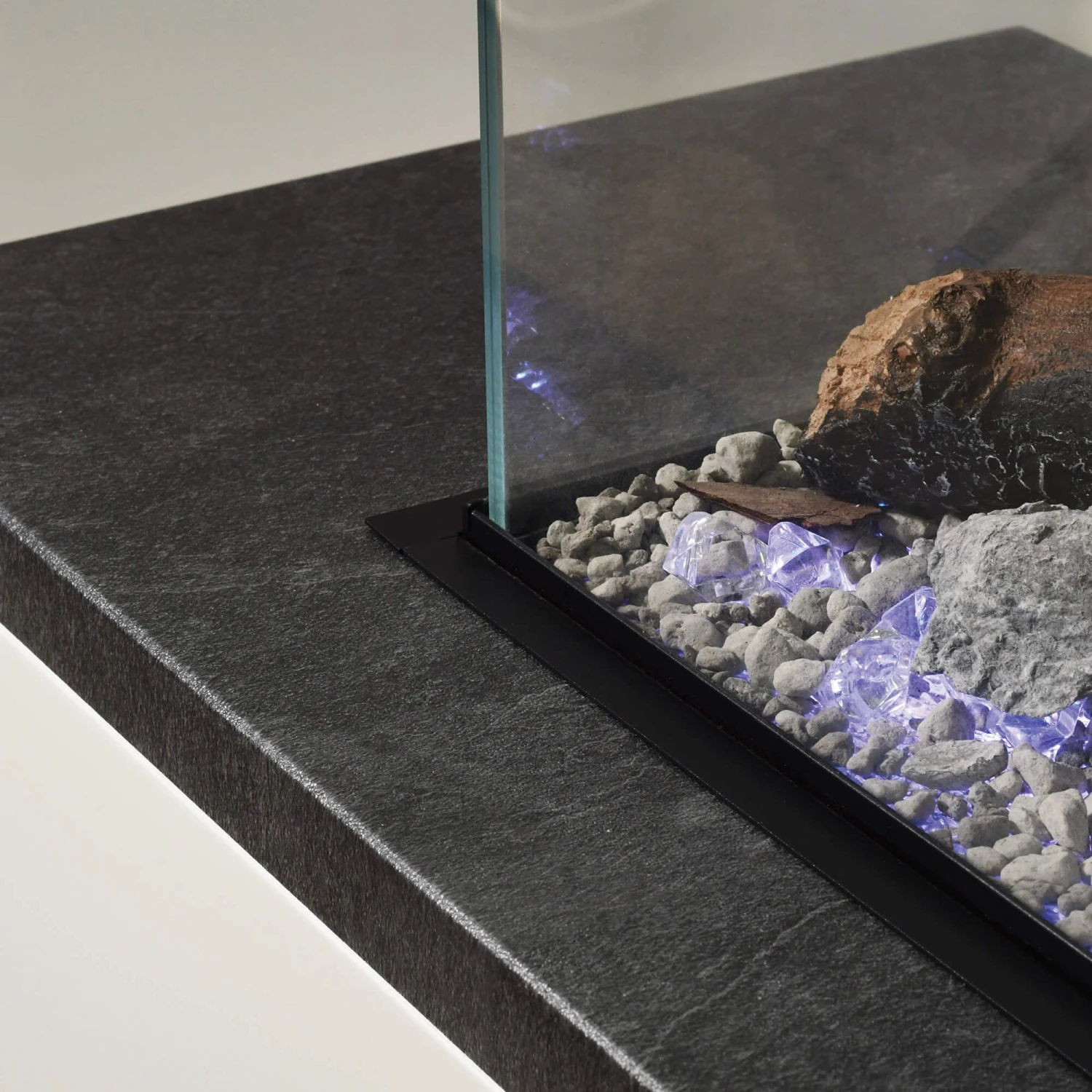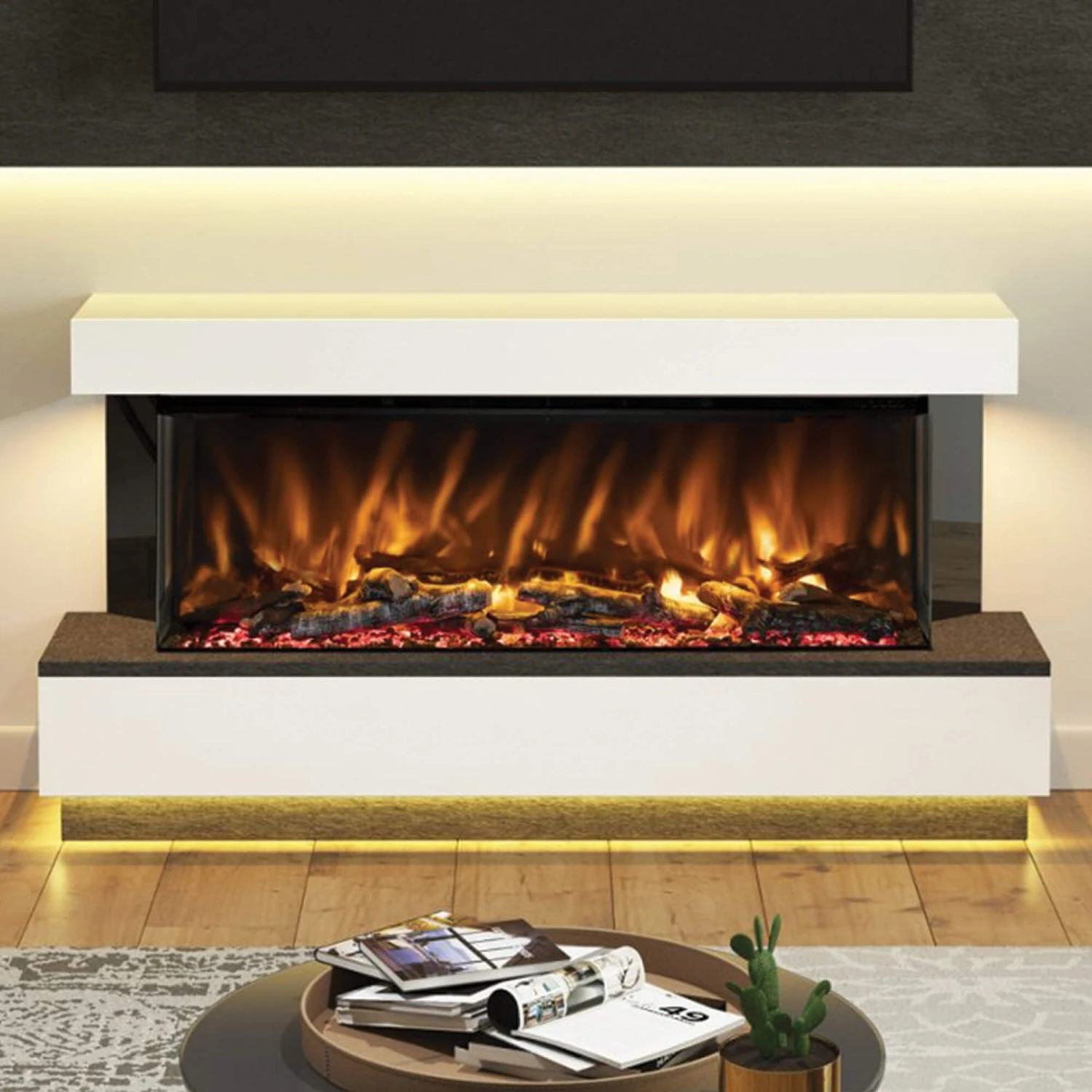 The contemporary fireplace has a range of colours to create your perfect ambience. You have 3 different flame colour options, paired with 13 colours for your fuel bed, including a rotation setting, meaning you have complete control.