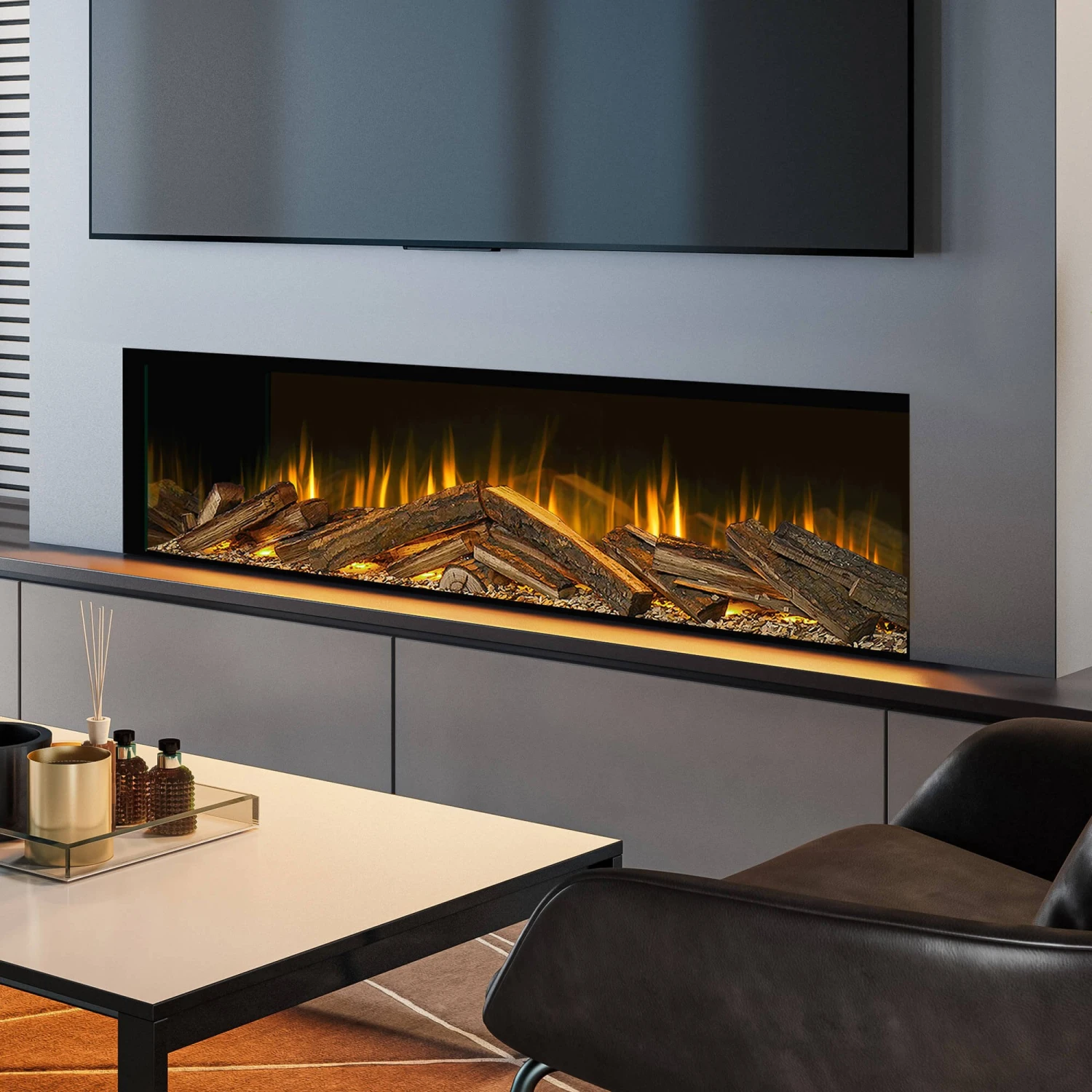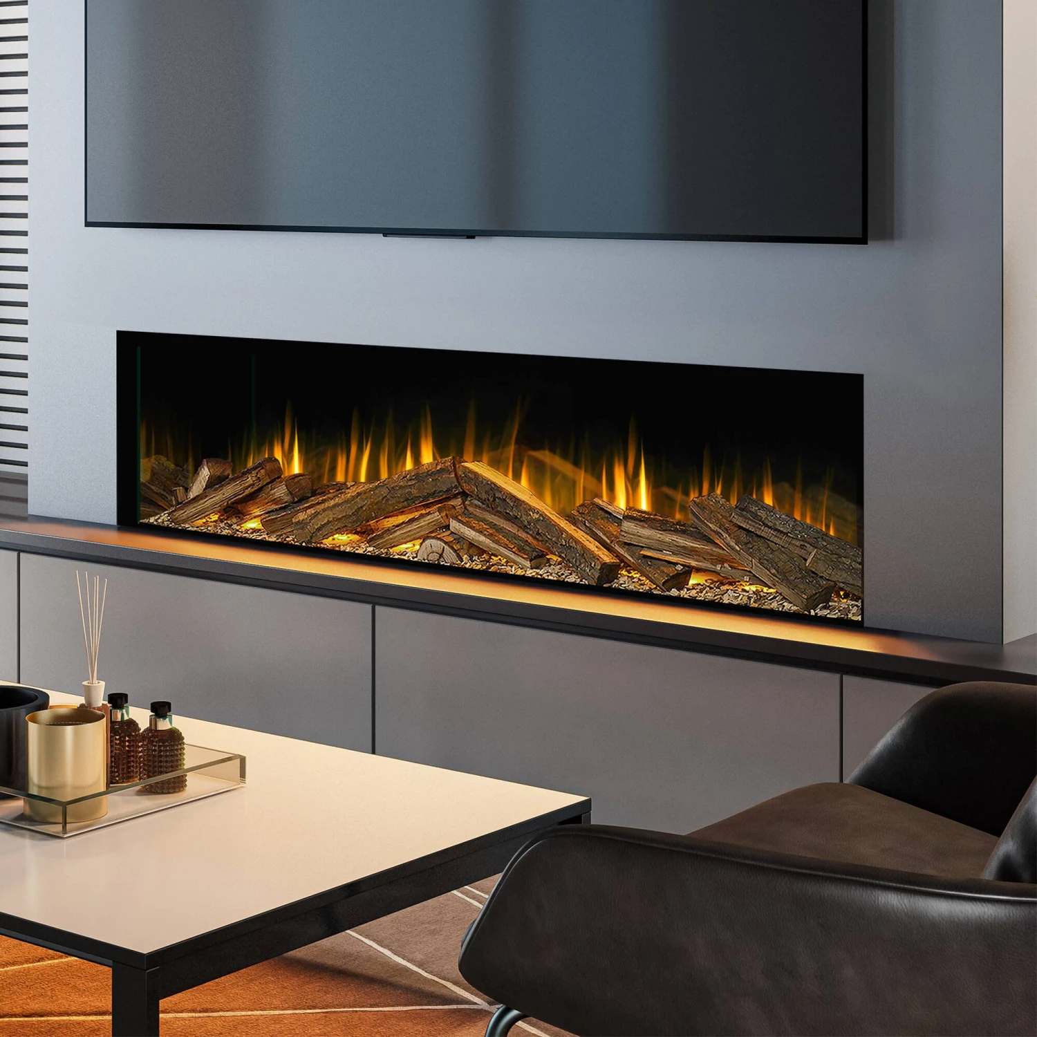 As a flagship Evonic model, this spectacular 1500mm media wall fire is designed to become the focal point of your living space. The fire’s stunning visuals are powered by the latest LED flame technology, providing an immersive and realistic flame effect that is further enhanced by the Ultra-HD anti-reflective glass, a signature feature of Evonic Fires. This advanced glass significantly reduces glare and reflections, ensuring a vibrant, unobstructed view of the mesmerising flames and the meticulously hand-crafted Cotswold log set. The deep, fixed log fuel bed offers an authentic and powerful roaring flame display, combining the charm of a traditional fireplace with the convenience of an electric model.
