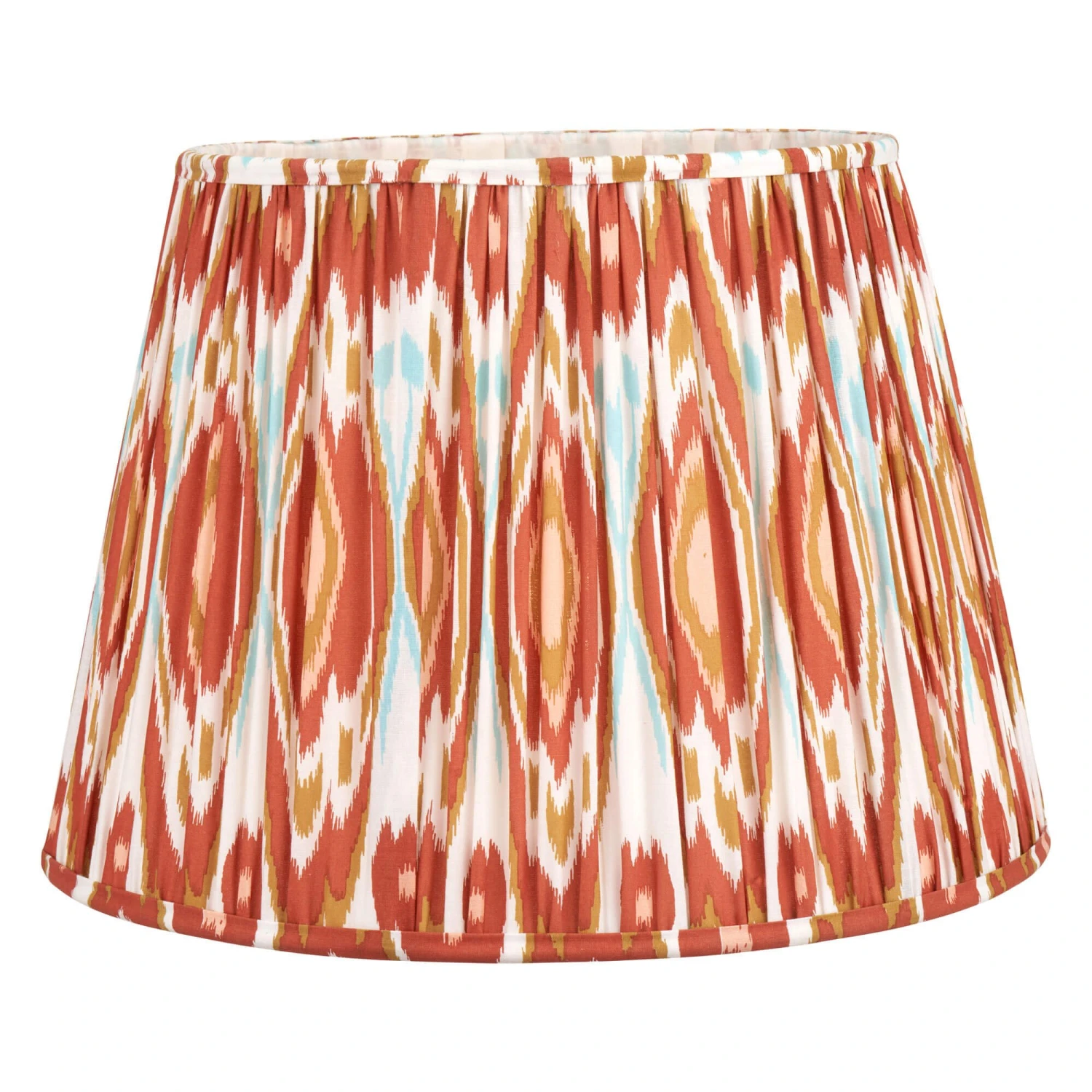 Add beautiful pattern and texture to your space with this Ezra Cinnamon Patterned 45cm Shade. Made from cotton, this gathered and tapered lampshade is adorned with a stunning Ikat pattern in cinnamon and apricot tones, creating a eye-catching and captivating look. Available in various colours and sizes, this striking lampshade is perfect for adding a vibrant yet bold pop of colour to any interior.