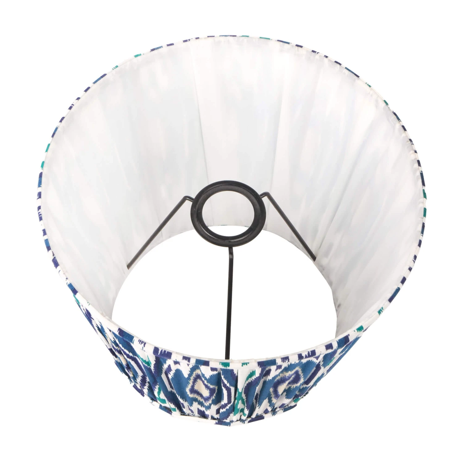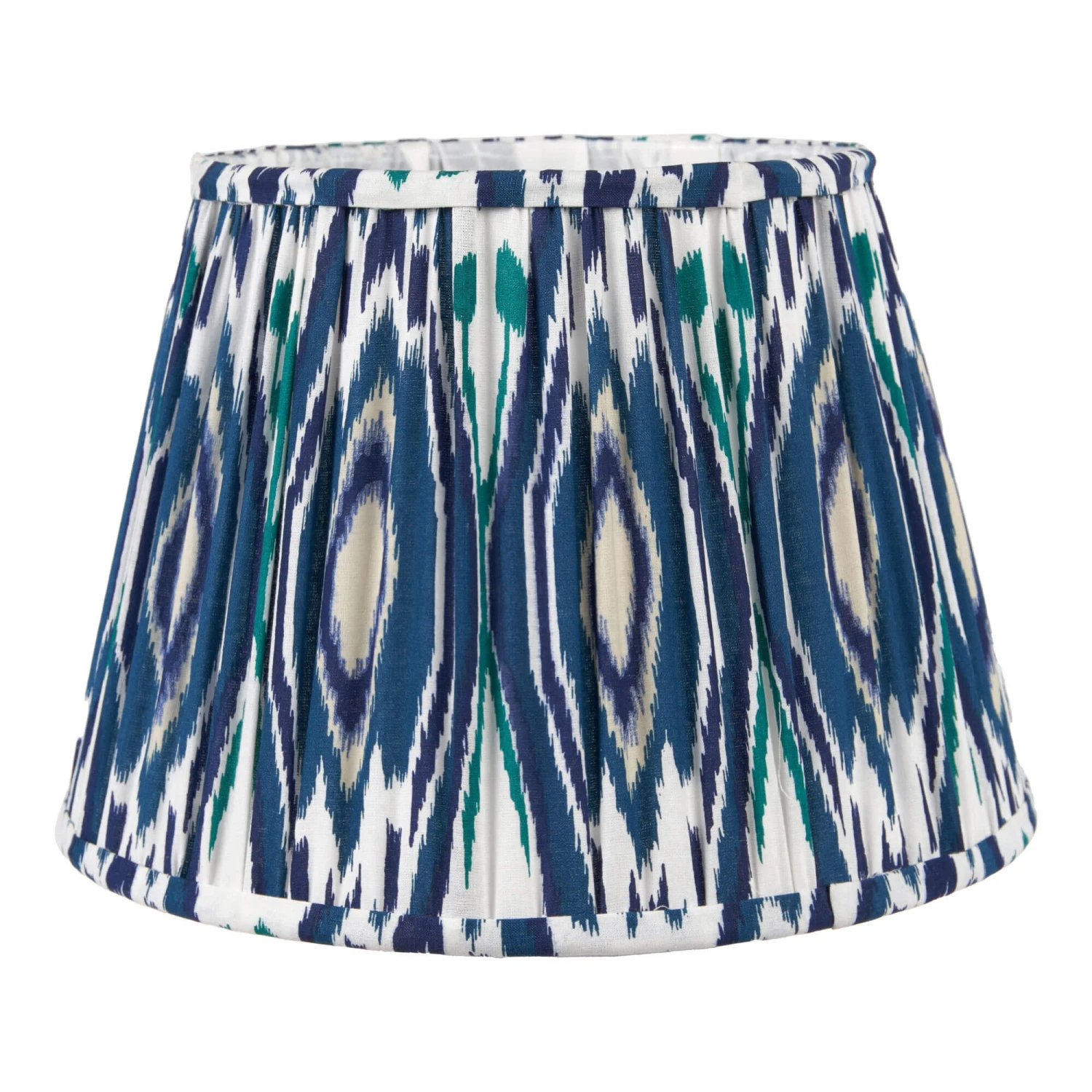 Add beautiful pattern and texture to your space with this Ezra Ocean Blue Patterned 45cm Shade. Made from cotton, this gathered and tapered lampshade is adorned with a stunning Ikat pattern in blue and natural tones, creating a eye-catching and captivating look. Available in various colours and sizes, this striking lampshade is perfect for adding a vibrant yet bold pop of colour to any interior.
